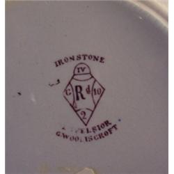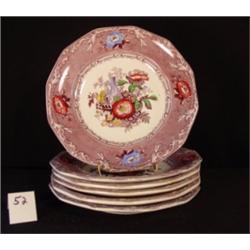 6- 8 1/2" Octagonal Staffordshire plates, mulberry colored ironstone transferware by G. Wooliscroft in "Excelsior" pattern, with red, light blue and green overpainting. Design includes a wine bottle. On 3 of the plates it is painted solid blue and the on the other 3 it is striped blue. Great condition with 1 plate having a rough area on the rim.