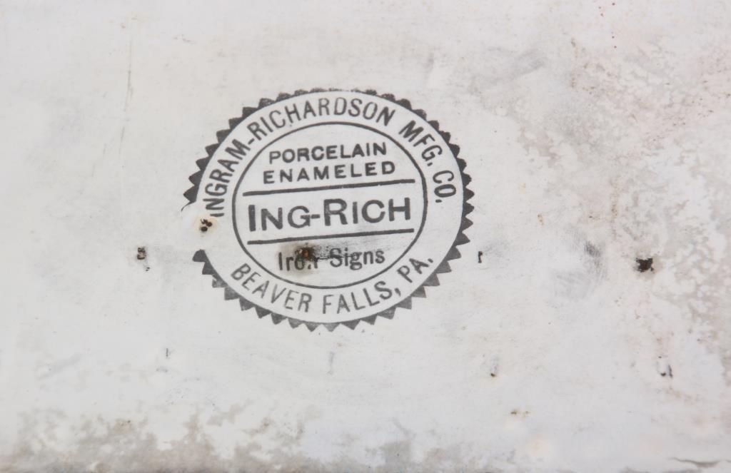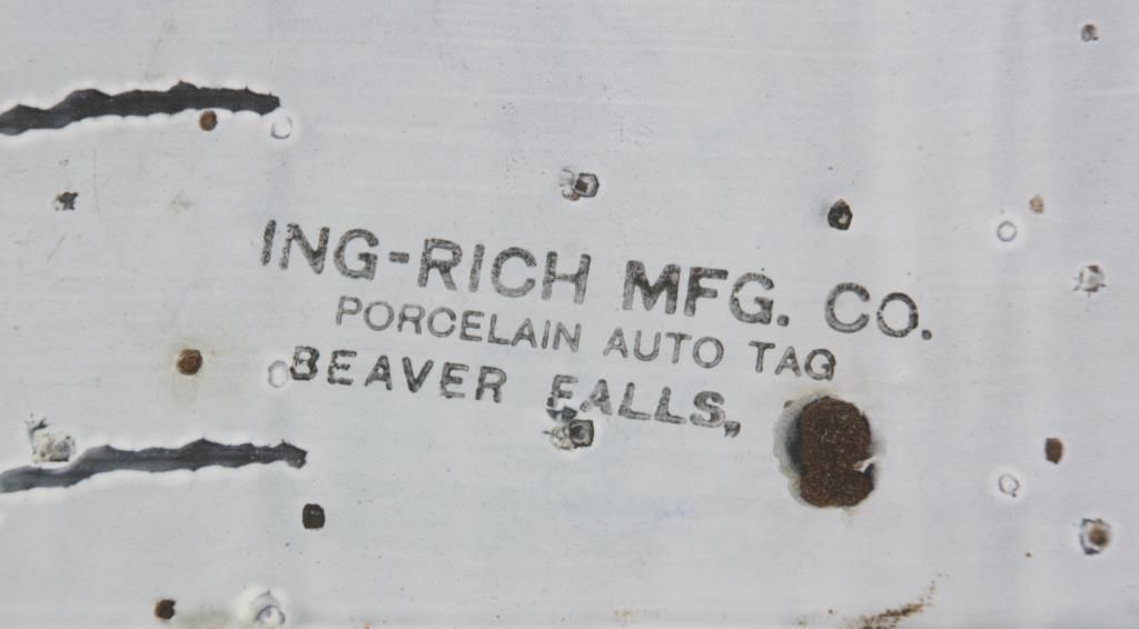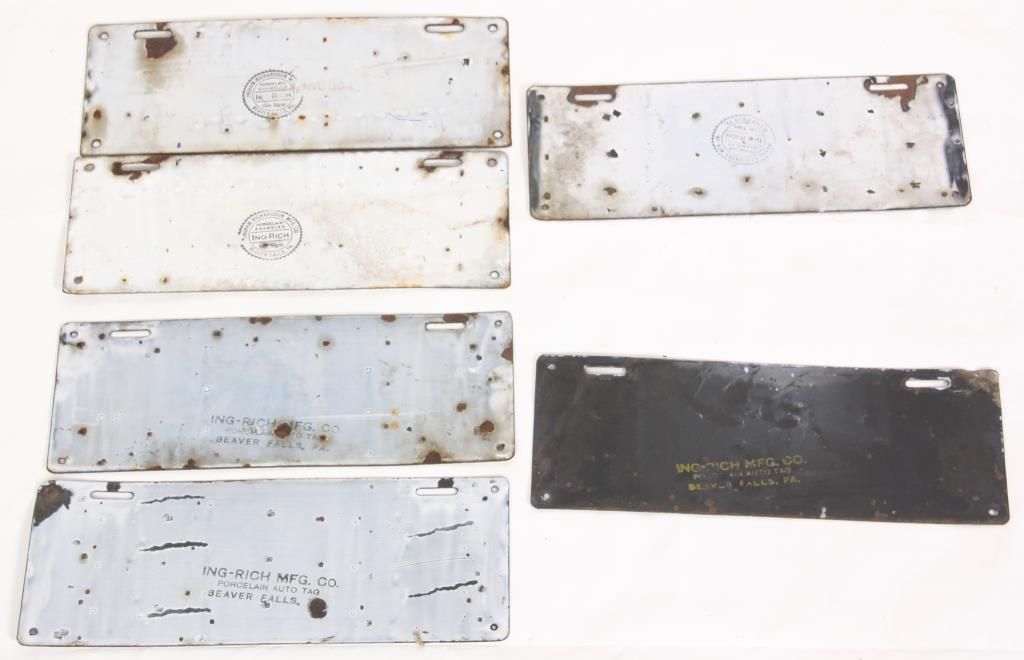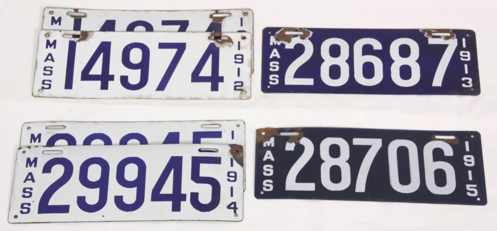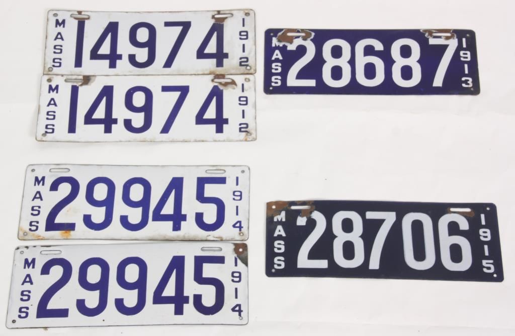 6 Massachusetts Porcelain License Plates. The porcelain enamel license plates measure 5.5 in. high x 14 in. wide; two matching white plates are dated 1912, number 14974 – one blue plate dated 1913, numbered 28687, each signed Ingram-Richadson Mfg. Co. The other two matching white plates are dated 1915 and numbered 29945 and the final blue plate dated 1915, is numbered 28706, signed on the back Ing-Rich Mdg. Co. Plates have some typical chips to the enamel.