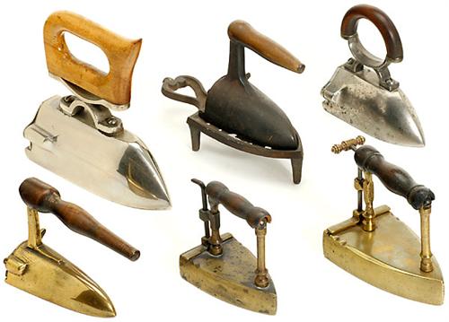 6 Miniatur-Bügeleisen 1) Biedermeier-Bolzeneisen, Messing, Schieber Nr. 0, Länge 9 cm. - Sehr selten! - 2) Ochsenzunge mit Untersetzer, Länge 9,5 cm. - 3) Ochsenzunge, vernickeltes Gußeisen, Länge 10,5 cm. - 4) Biedermeier-Bolzeneisen, Messing, Schieber Nr. 3, Länge 10,5 cm. - Und: 5) Ochsenzunge, Länge 10 cm. - Sowie: 6) Messing-Ochsenzunge, Länge 10 cm. - Alle Eisen mit Bolzen.