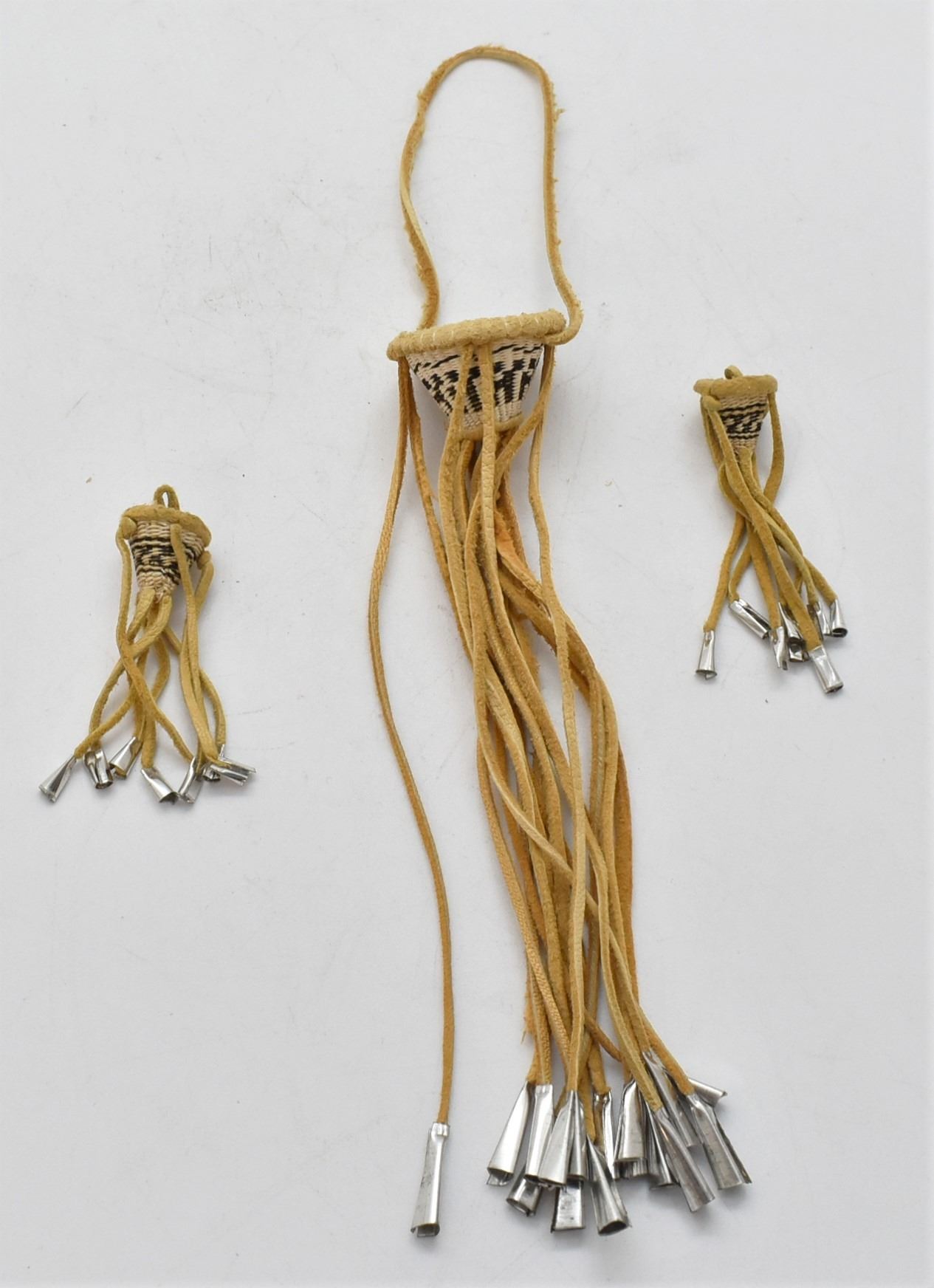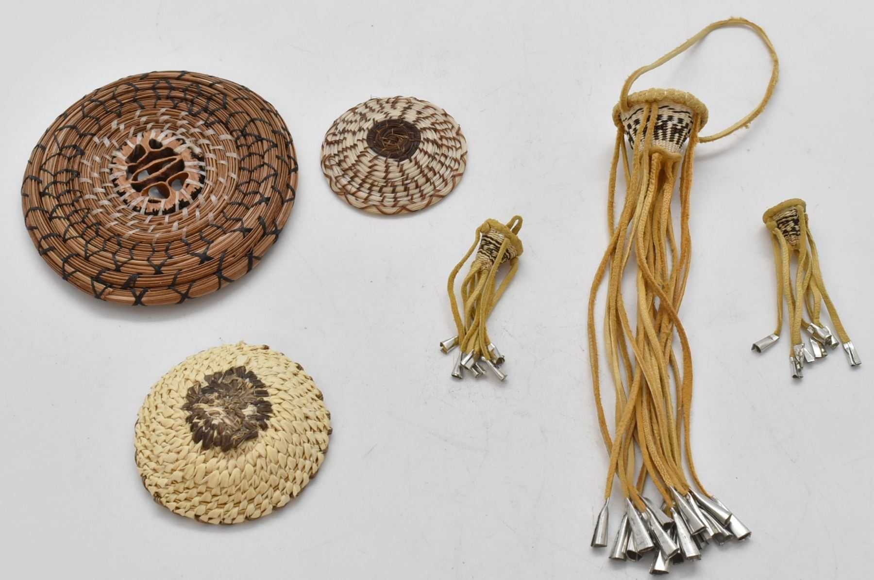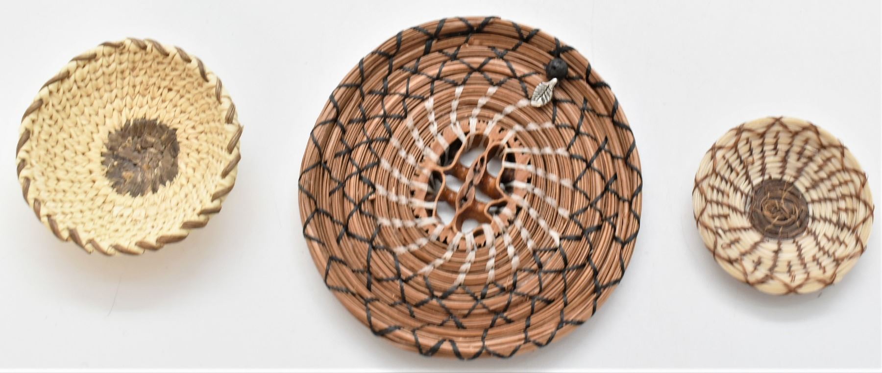 6 Miniature Native American Baskets, includes 3 Miniatures Apache Burden Baskets and 1 Miniature Tohono O'odham Horse Hair Basket, 1 Miniature Tohono O'odham Basket, and 1 Pine Needle Basket with Black Walnut Shell Slice Center, largest measuring 4''D
