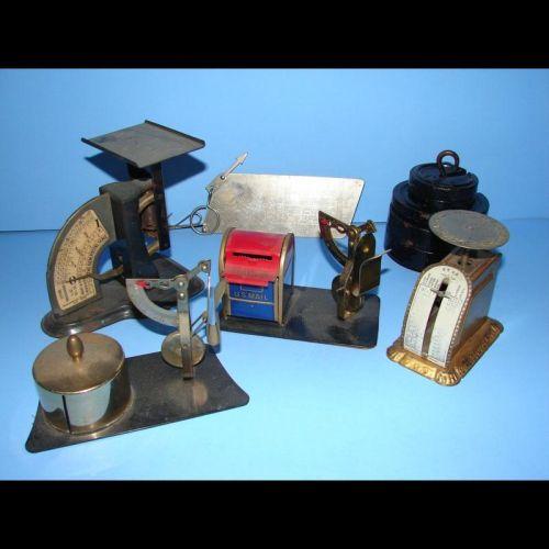 6 Miniature Scales Star, US Mail Box, Gem Postage, Postal Rates & Stack of round cast iron weights.