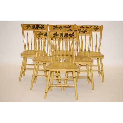 (6) N.E. PAINTED THUMB BACK WINDSOR CHAIRS IN MUSTARD YELLOW PAINT W/ FRUIT & FOLIAGE DECORATION, 5 SPINDLE BOWED BACKS, SHAPED SEATS & SPLAYED LEGS W/ OFFSET BOX STRETCHERS (32 1/2" T X 17 1/4" W X 19" D)-OLDER REPAINT, WEAR, REPAIRS, IMPERFECTIONS