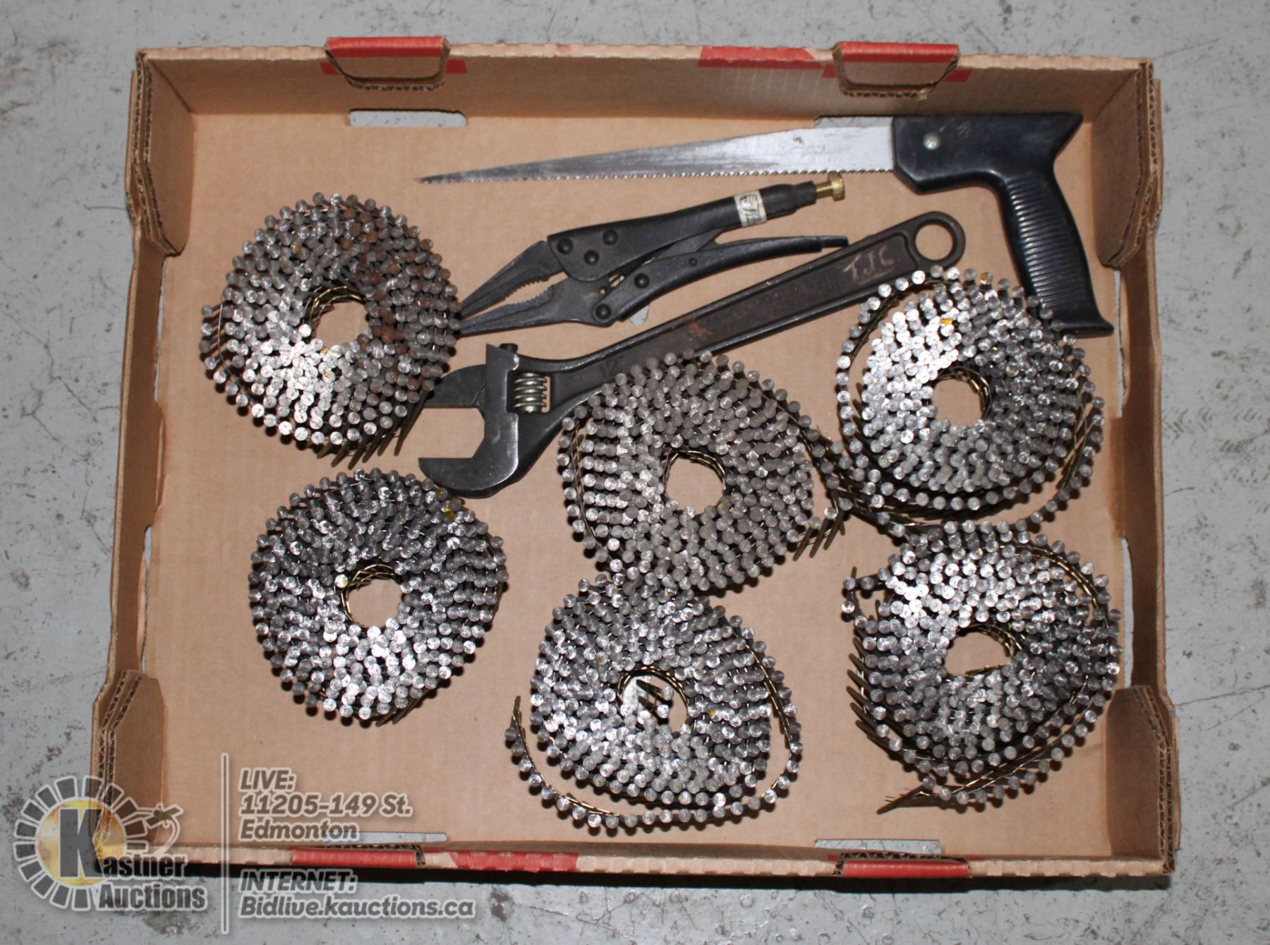 6 NAIL COILS, HAND SAW, WRENCH & VISE GRIPS
