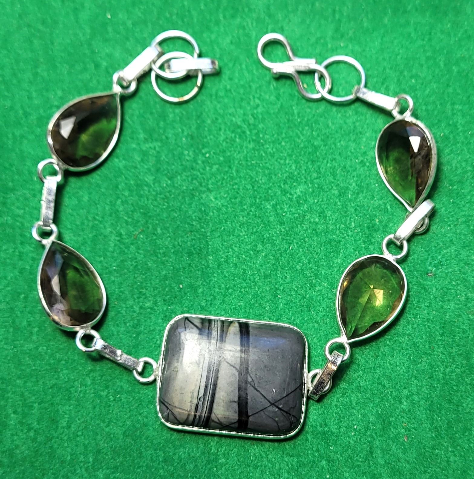 SETTING STAMPED 925, NOTE STONES APPEAR GREEN BECAUSE OF THE BACKGROUND COLOR, THEY ARE ACTUALLY SMOKEY GREY/BROWN. JEWELLERY