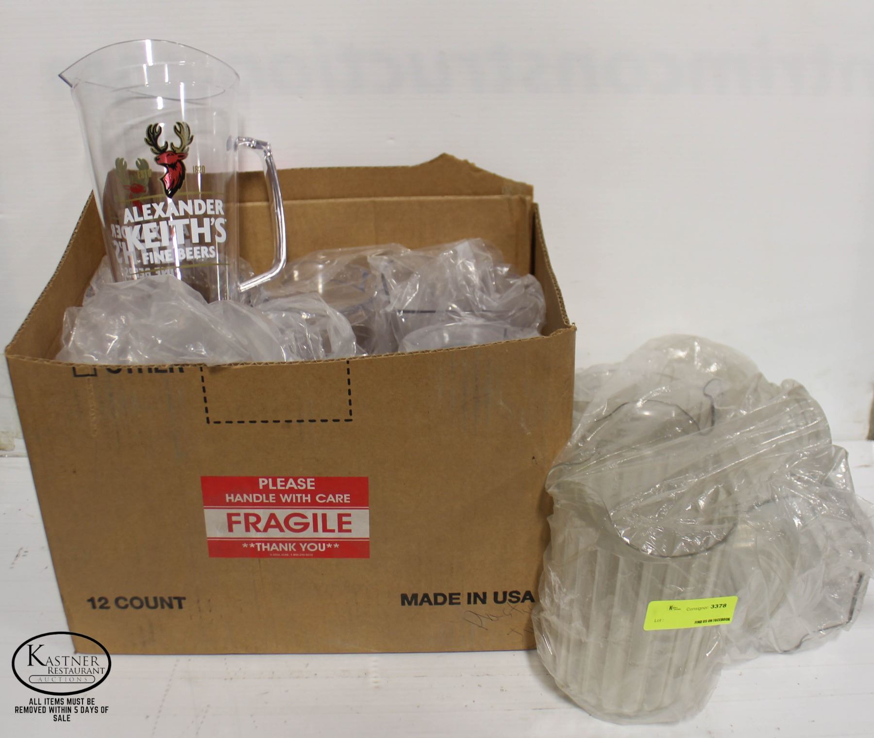 POLY PITCHERS. NEW PITCHERS: ALEXANDER KEITH'S BRANDED, GRIMM INDUSTRIES, MADE IN USA. **ALL ITEMS MUST BE REMOVED BY 5PM MONDAY, JULY 3RD, 2023. ALL REMAINING ITEMS WILL BE SUBJECT TO A $6.00 PER DAY STORAGE CHARGE. ANY ITEMS REMAINING AFTER MONDAY, JULY 17TH, 2023 WILL BE CONSIDERED FORFEITED. NO REFUNDS WILL BE ISSUED FOR FORFEITED ITEMS.** TO SCHEDULE A PICK UP APPOINTMENT CLICK HERE