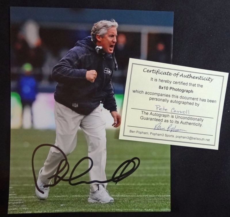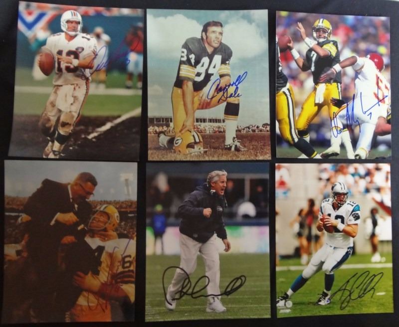 6 - NFL AUTOGRAPHED PHOTOS, DAN MARINO (NO COA), KERRY COLLINS, PETE CARROLL,
