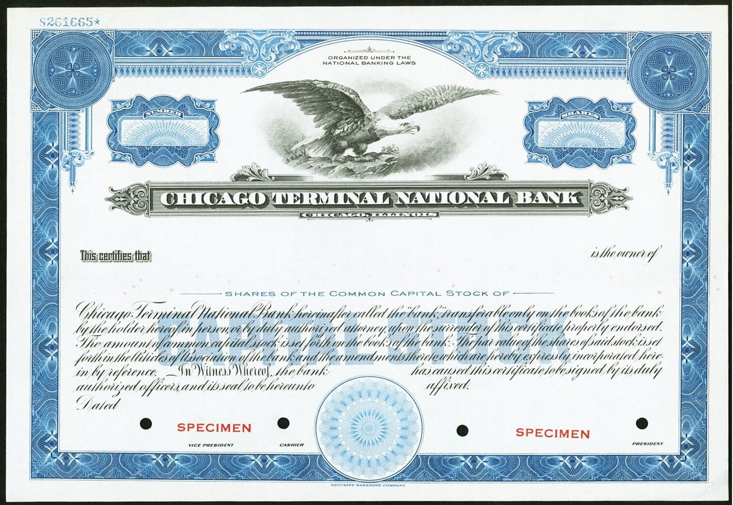 Chicago, IL- Chicago Terminal National Bank Ch. # 13659 Specimen XF, 4 POCs; Tulsa, OK- Fourth National Bank Ch. # 13480 Specimen Choice CU, 4 POCs; Boyertown, PA- National Bank of Boyertown Ch. # 2137 Specimen VF, 4 POCs; Phoenixville, PA- Farmers and Mechanics-National Bank Ch. # 1936 Specimen AU, 4 POCs; West Chester, PA- National Bank of Chester County Ch. # 552 VF, 8 POCs, "Cancelled" printed diagonally, toned paper; Marshall, TX- First National Bank of Marshall Ch. # 3113 Specimen AU, 4 POCs.