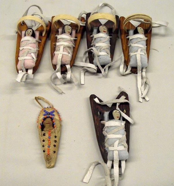 6 Native American Miniature Cradle Board Dolls. Largest measures approx. 3'' x 1 1/4''. Buyers Pay Actual Shipping and Handling Charges(see terms and conditions for more information).