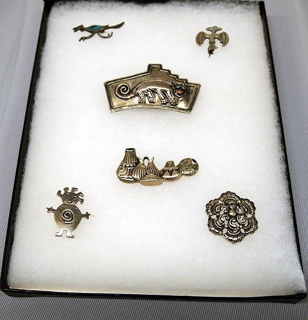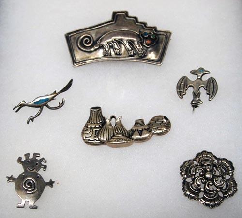 6 Native American Silver Pins, 3 with Coral & Turquoise Accents, largest measures 1.5'' x 2''. Buyers Pay Actual Shipping and Handling Charges(see terms and conditions for more information).