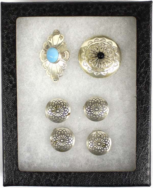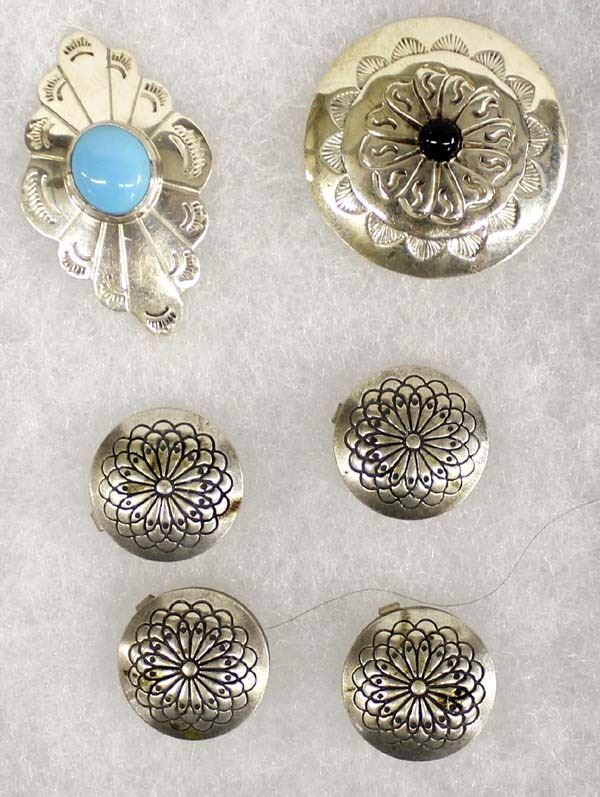 6 Navajo Button Covers, 2 are marked Sterling, longest measures 1.5'' x 1'', one sterling cover has a small obsidian cabochon and the other sterling cover has a turquoise cabochon