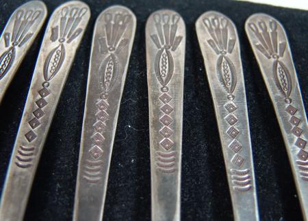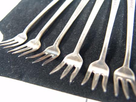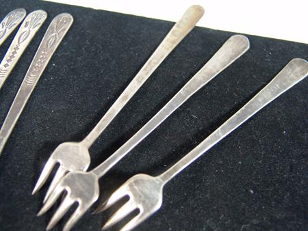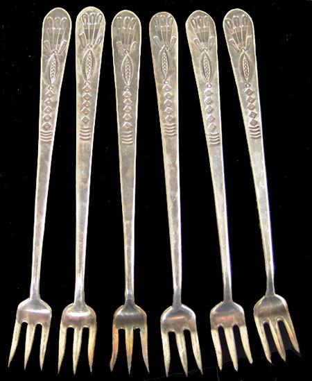 Six outstanding hand wrought forks with hand stamped handles. 6" each