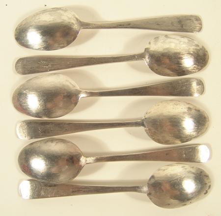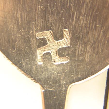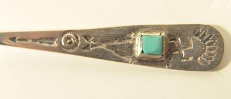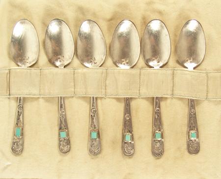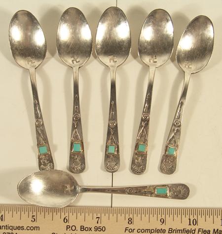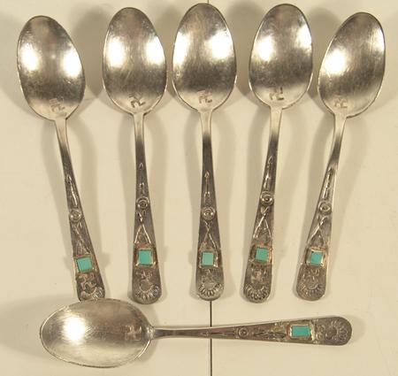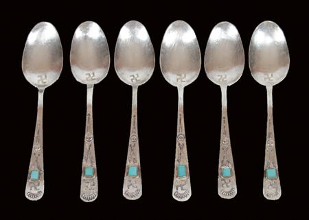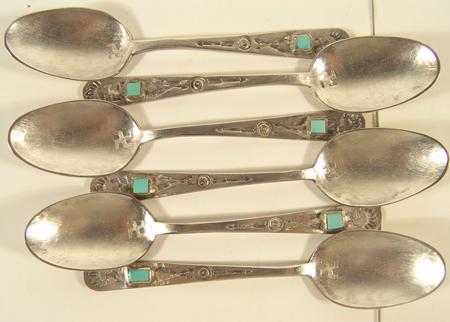 Old set of hand hammered (from silver Peso's) teaspoons with stamped arrows and fylfots - each set with a single square cut turquoise stone. Provenance dates 1914.