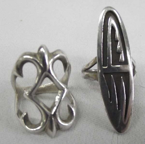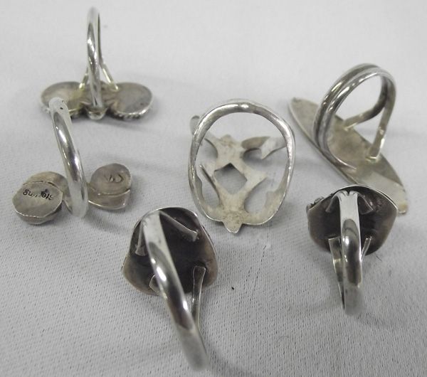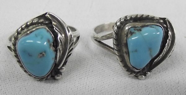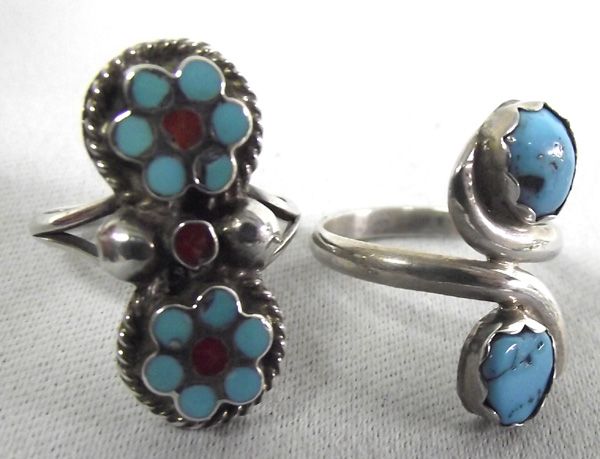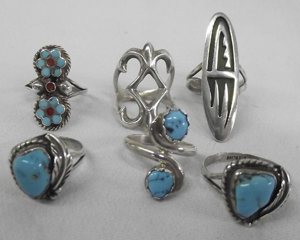 6 Navajo Zuni Sterling Turquoise Rings. All rings are sterling silver. The largest is the oval shape with the cutaway design, which measures 1.5''L x 0.5''W. There is a sandcast ring and the other 4 all have turquoise nuggets. The double cluster ring is channel inlay of turquoise and coral. Sizes range from 5.5 to 10.