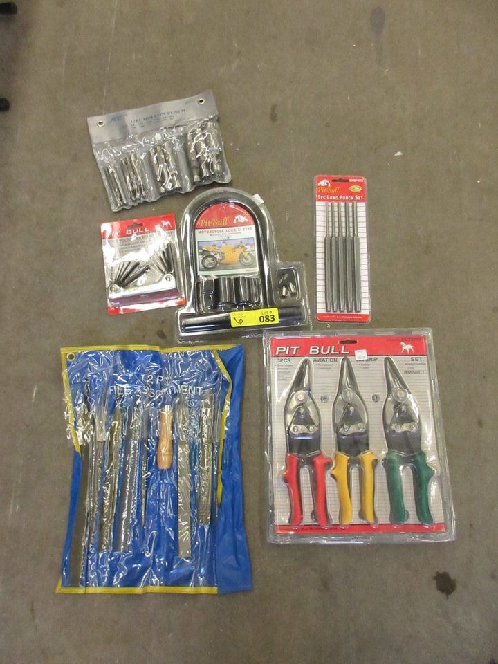 3 Piece Aviation Snips, File Set, Cycle Lock, Hex Key Set, and 2 Punch Sets.