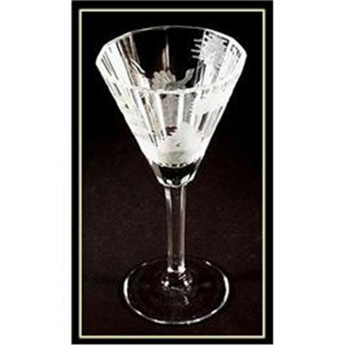 Gorgeous, panel cut hand engraved sherry stem from the Art Deco era. This set of (6) is part of large set, other pieces are available separately. Each piece is engraved with Woodland scene and GROUSE as main motif. Classic LOBMEYR design, probably produced by MOSER in the 1920's. Other stems are engraved with Pheasant, Wild Boar , Duck, Fawn and Deer. It is extremely rare to find COMPLETE vintage set in excellent condition. We tried to take good picture, but it is very difficult to capture the beauty, which eye so easily perceives... Pictured is 1 piece, but remember you are buying set of 6. Comparable stem is pictured in the book "Moser Artistic Glass" Edition II, page 136, plate 163, which is valued $600-$800 per piece. Only one piece from this 57 pc set (large platter) is acid etch signed "Made in Czechoslovakia". Dimension : 4-5/8" high.