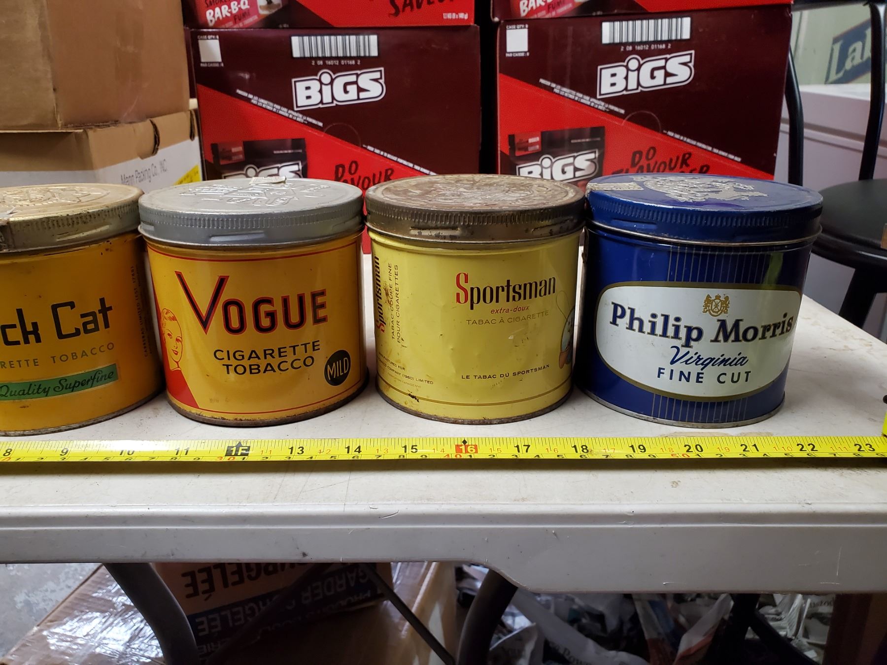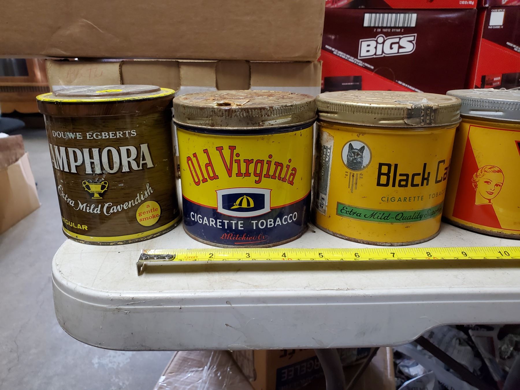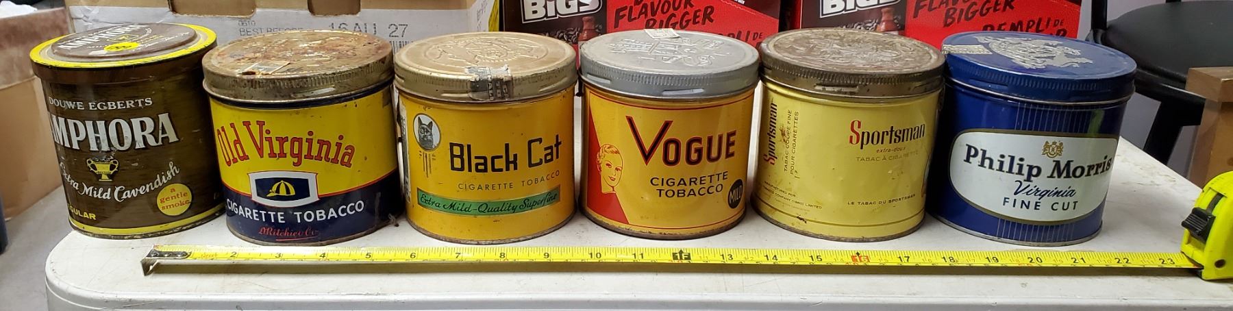 6 OLD TOBACCO TINS - BLACK CAT, OLD VIRGINIA, VOGUE, ETC