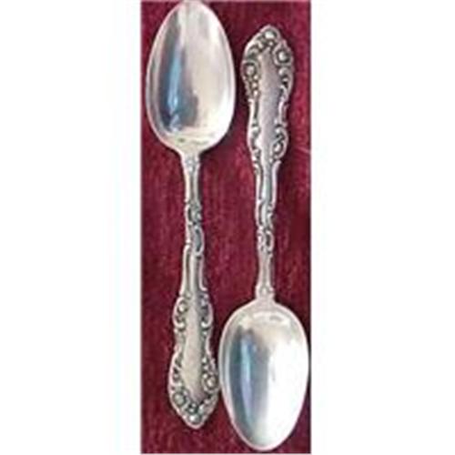 This set of 6 lovely 5 1/2" long sterling spoons is in the Old English pattern by Towle. This early pattern features a border of roses. These spoons are monogramed E on the front and 02 on the back. They are in very good condition with a ding in one of the bowls and will cost $5 to ship to US addresses.