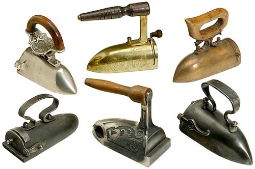 6 Ochsenzungen, um 1900 1) Messing, mit seitlich gravierten Wildschweinen, mit Bolzen, Länge 19 cm. - 2) Guß- und Schmiedeeisen, mit Bolzen, Länge 21 cm. - 3) Gas-Bügeleisen, Gußmetall, mit Drachen-Verzierungen, Länge 20 cm. - 4) Guß- und Schmiedeeisen, mit Bolzen, Länge 20 cm. - Und: 5) Messing, mit drachenförmigen Stützen, mit Bolzen, Länge 20 cm. - Sowie: 6) Vernickeltes Eisen, mit verziertem Hitzeschild und Bolzen, Länge 19 cm.