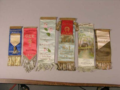6 PA. fireman's ribbons - Sharon/Bradford 1882/Meadville 1885/Warren, PA. 1886/Warren/Meadville 1885. Ex. cond.
