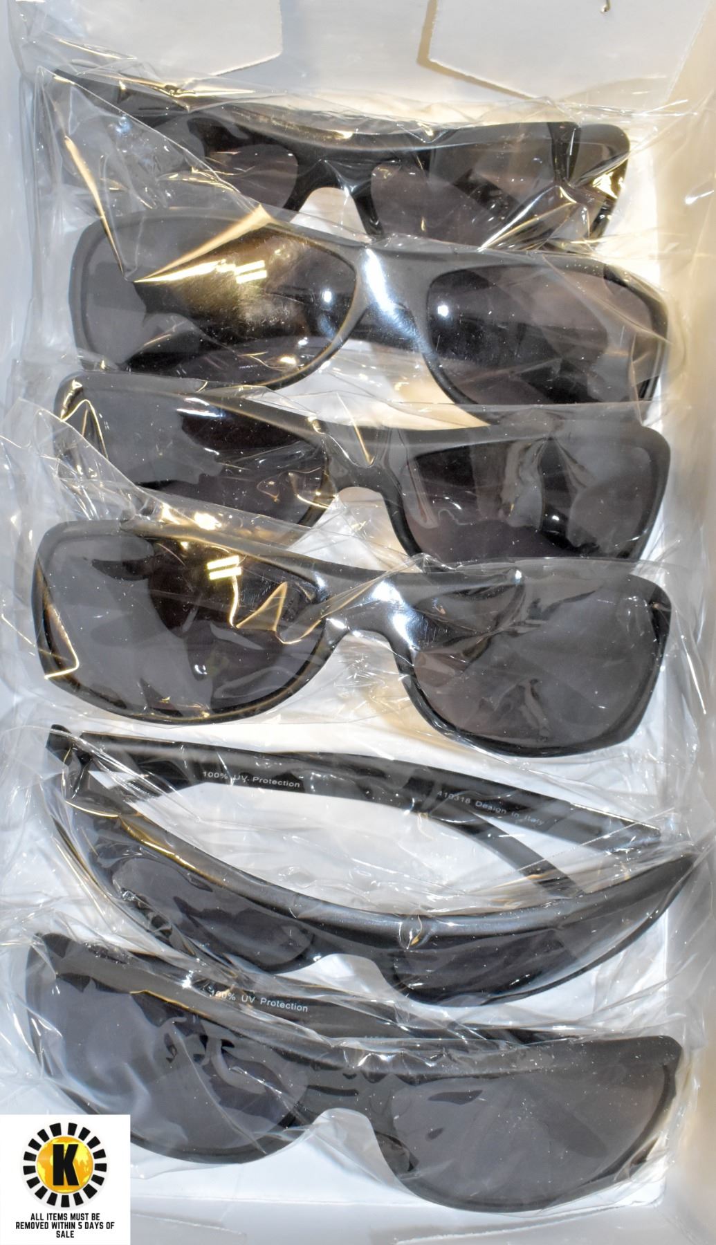 6 PAIRS OF BLACK WITH CHROME ACCENT MODERN SUNGLASSES. ALL ITEMS MUST BE REMOVED WITHIN 5 DAYS OF SALE