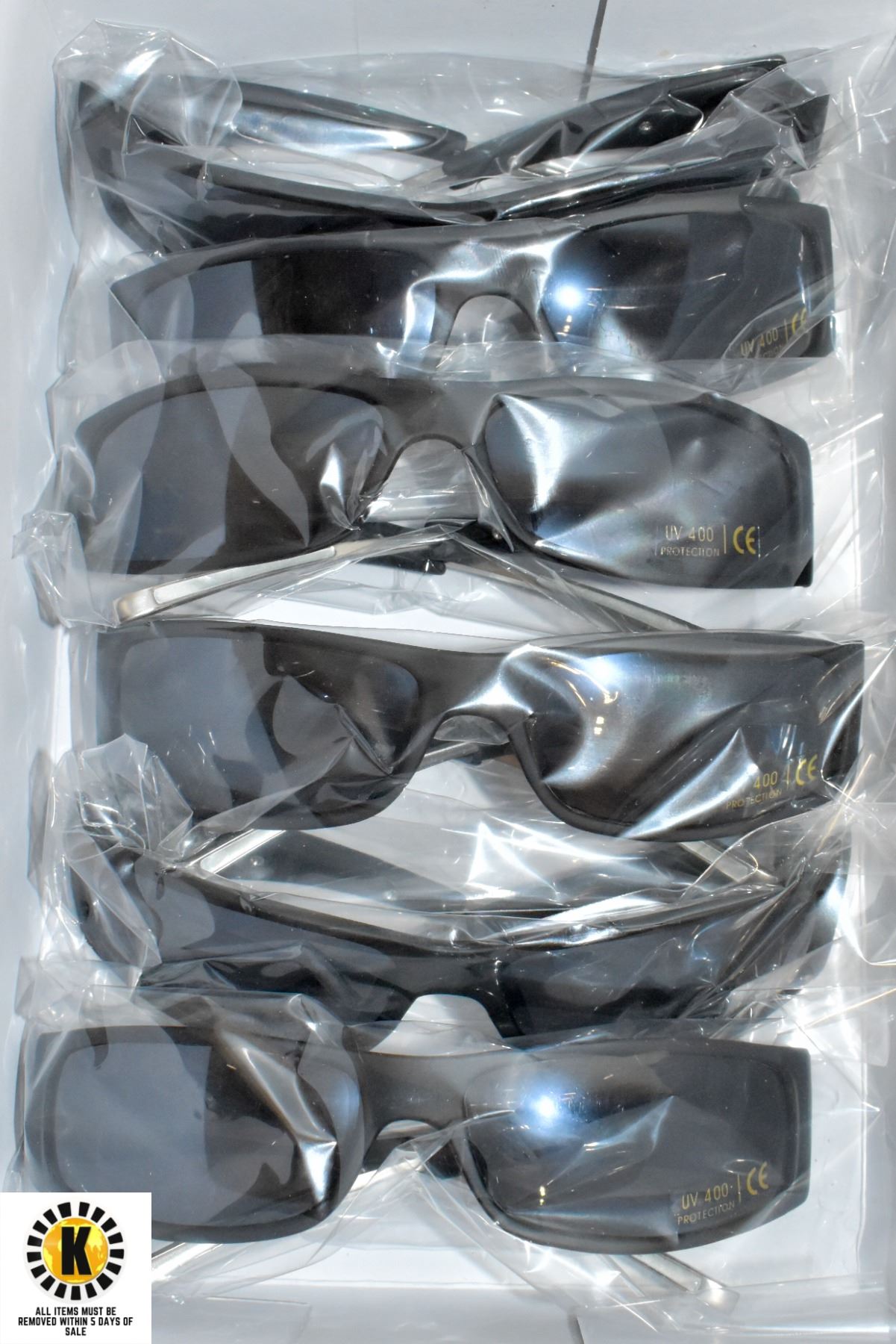 6 PAIRS OF BLACK WITH CHROME MODERN SUNGLASSES. ALL ITEMS MUST BE REMOVED WITHIN 5 DAUS OF SALE