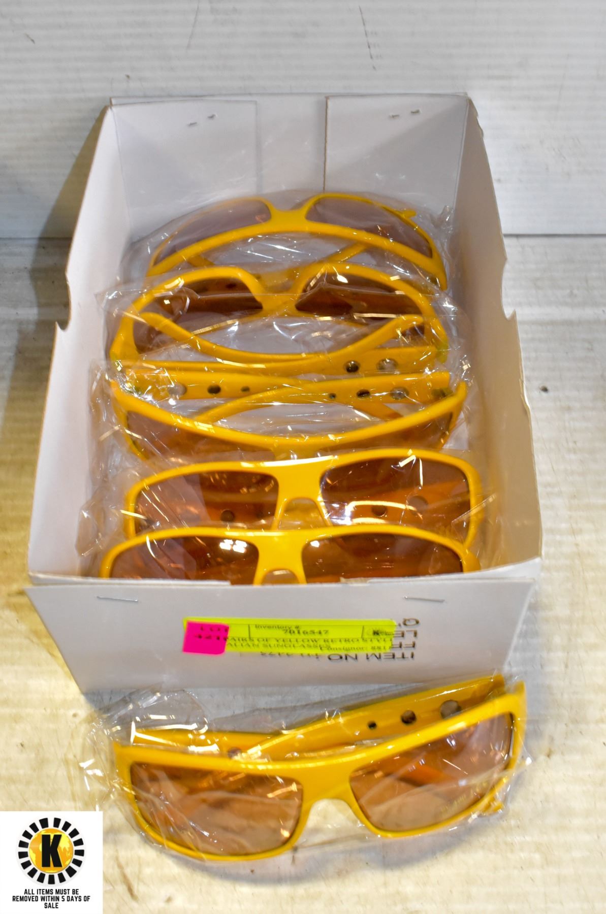 6 PAIRS OF YELLOW RETRO STYLED ITALIAN INSPIRED SUNGLASSES. ALL ITEMS MUST BE REMOVED WITHIN 5 DAYS OF SALE