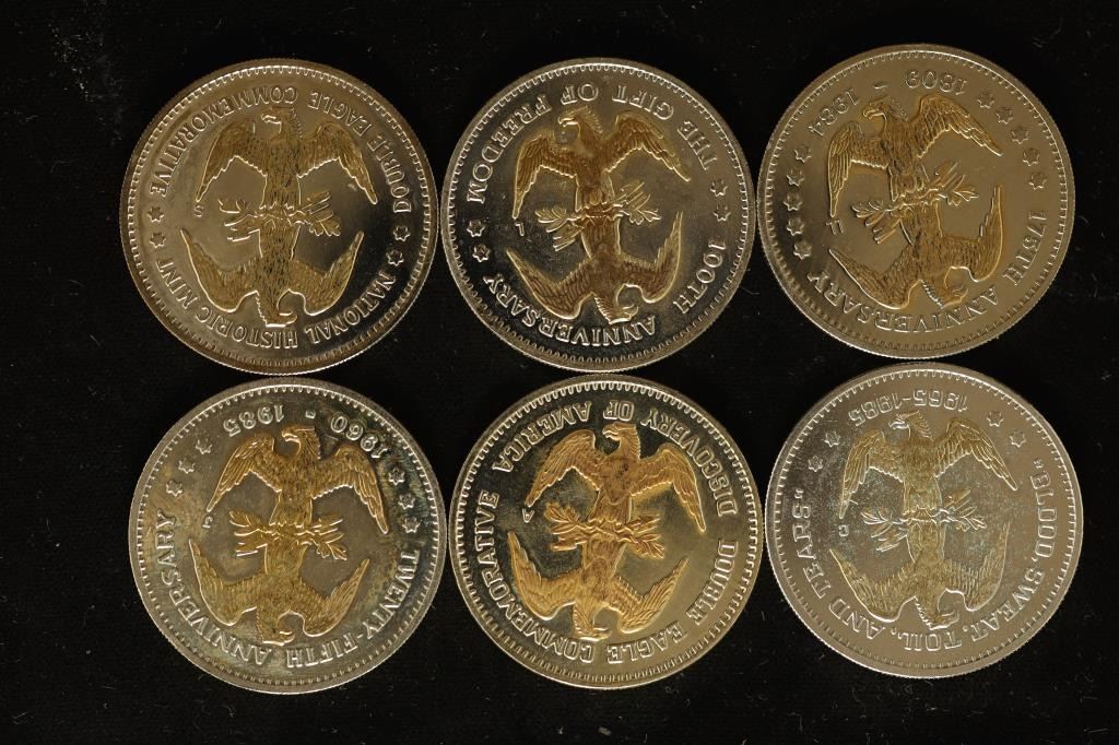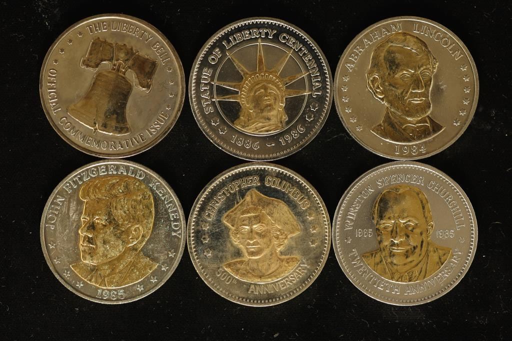 LIBERTY BELL, STATUE OF LIBERTY CENTENNIAL,  ABRAHAM LINCOLIN, KENNEDY HALF DOLLAR,  CHRISTOPHER COLUMBUS AND WINSTON CHURCHILL