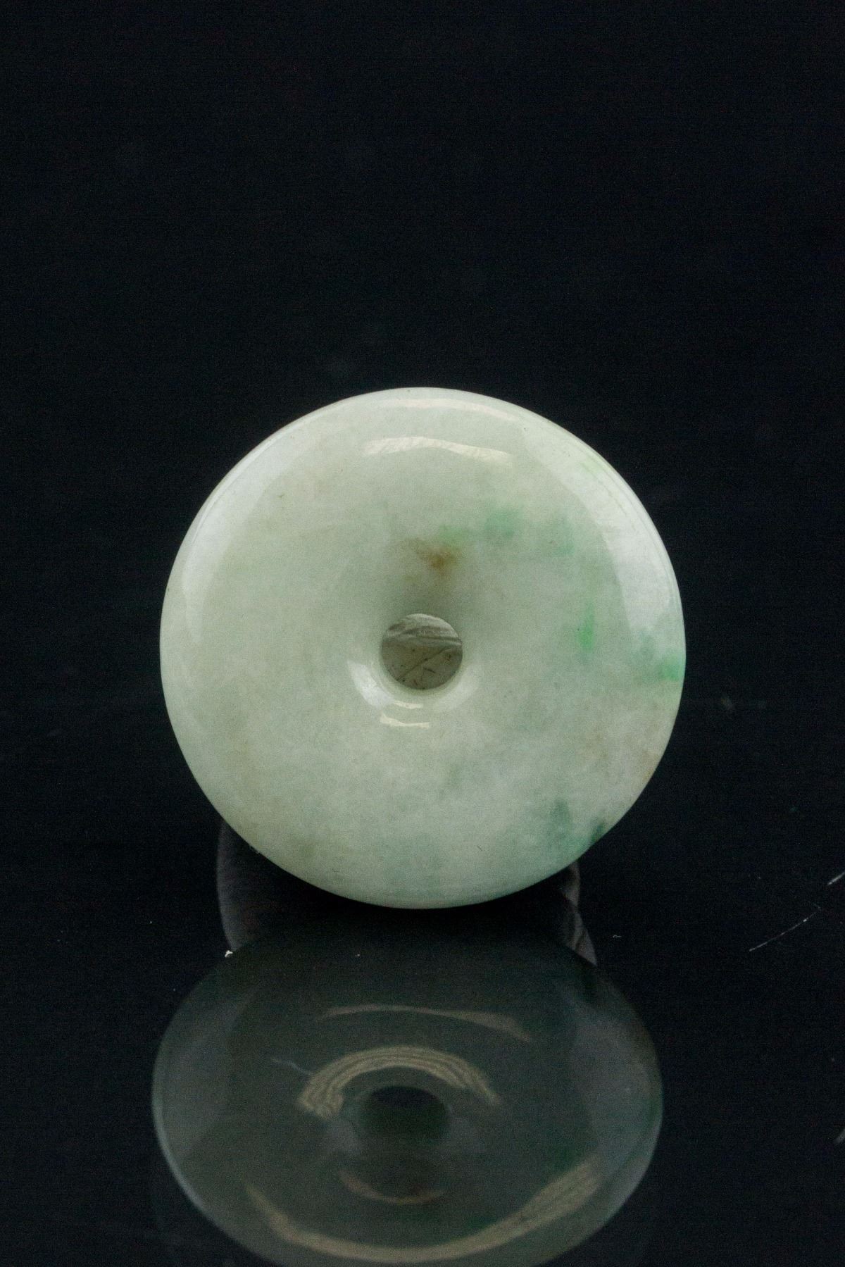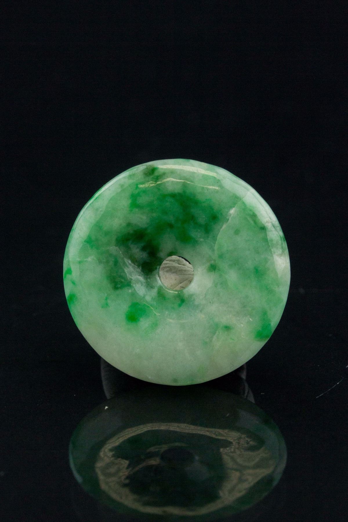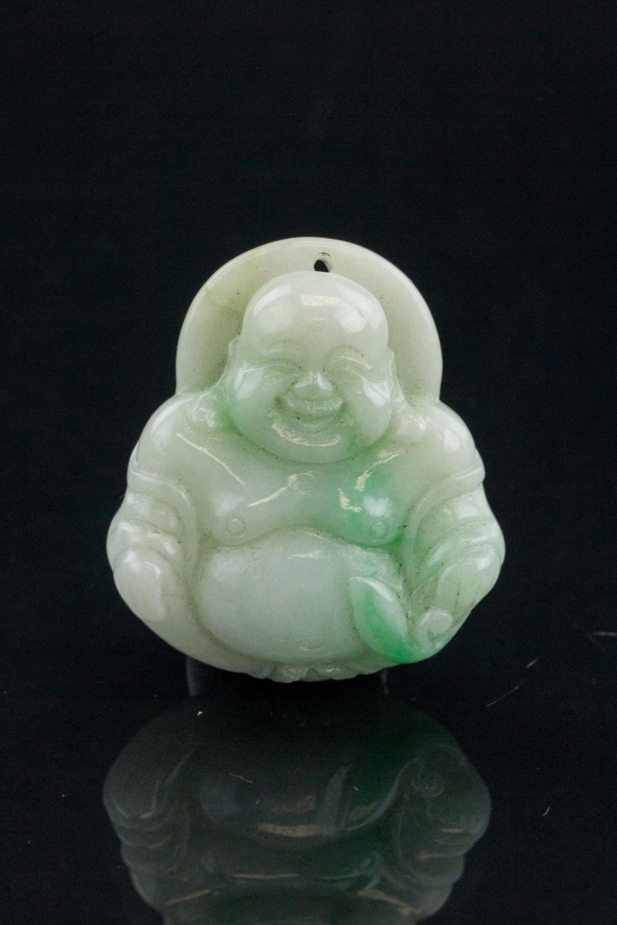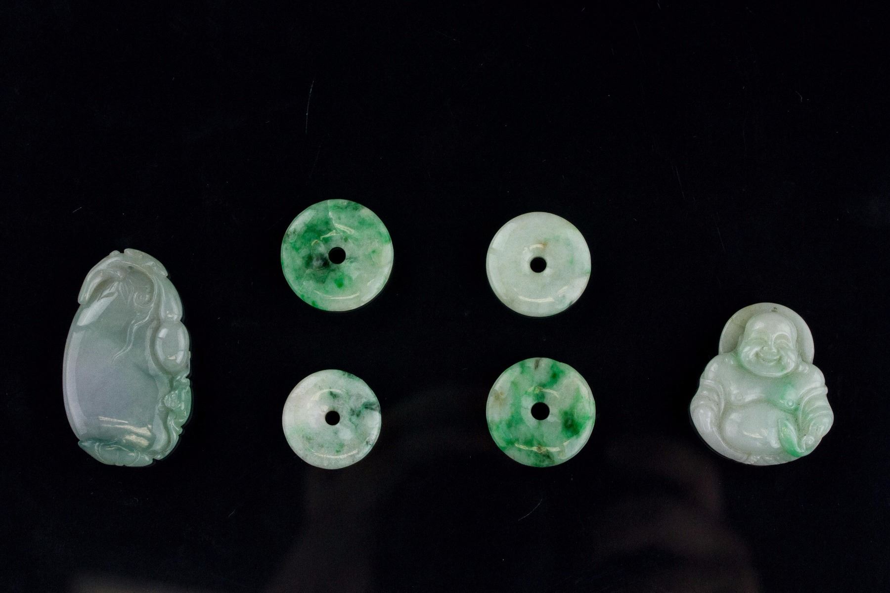 Six pieces of assorted Burma green jadeite pendants; comprised of 4 peace pendants, 1 lotus pendant and 1 Happy Buddha pendant; 2.5 cm x 2.7 cm; 50 grams (total), Density: 3.30-3.3
