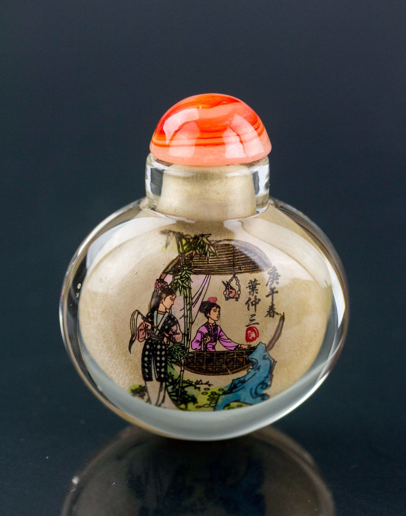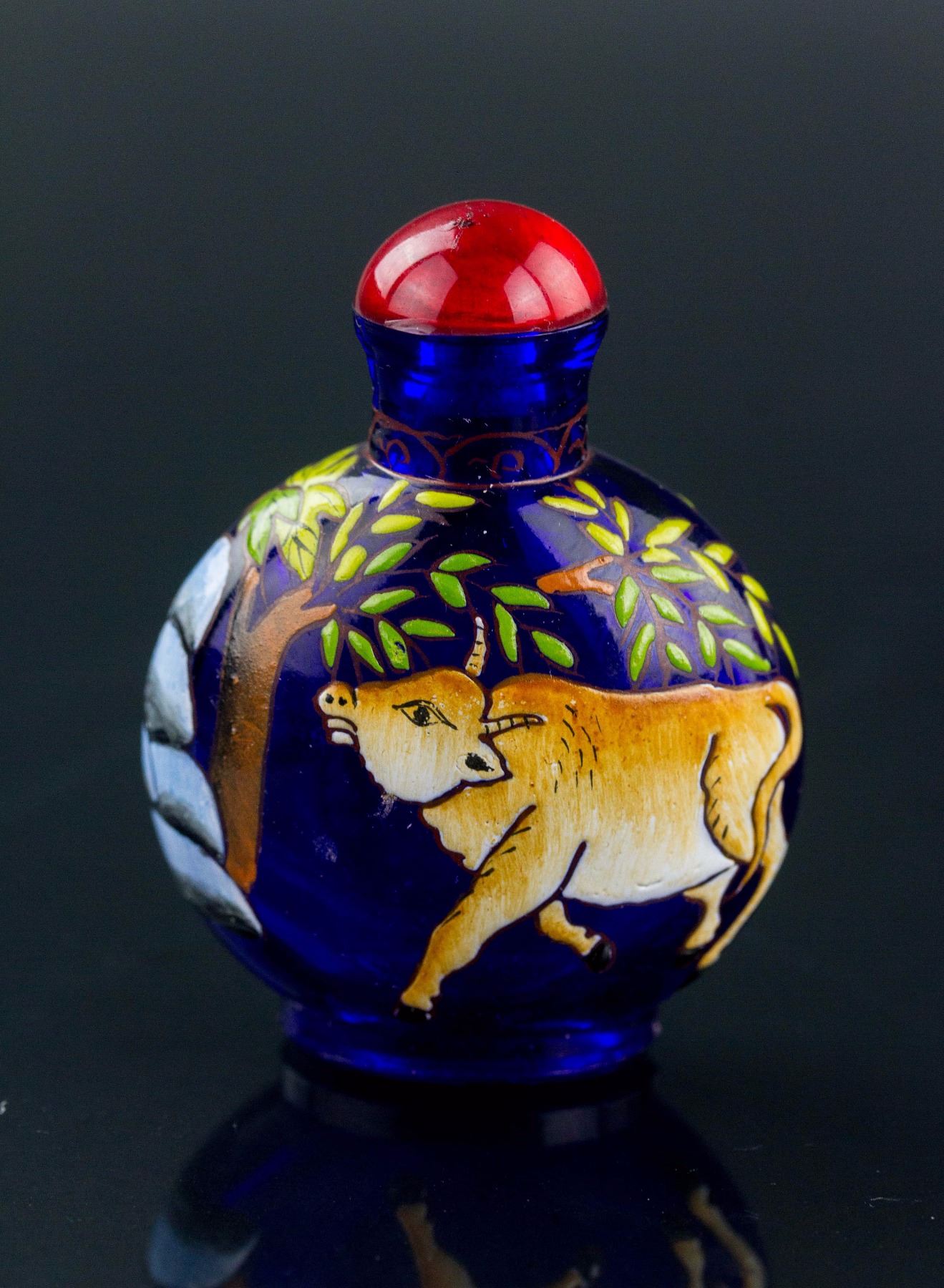 Six pieces of assorted Chinese Peking glass snuff bottles; comprised of 1 round snuff bottle, painted with cow and tree, with Ju Ren Tang mark on base; 4 rounded snuff bottles with inner painting, signed by artists Ma Shaoxuan, Zhou Heyuan and Ye Zhongsan; 1 ovoid snuff bottle with carving of auspicious symbols; 7 cm x 5 cm, 275 grams
