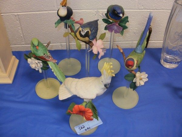6 PC. CERAMIC BIRDS ON GLASS STANDS BY FRANKLIN MINT