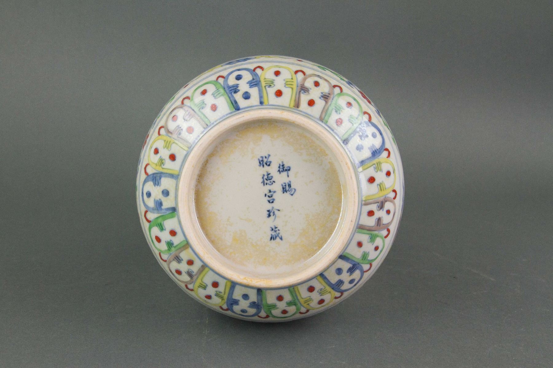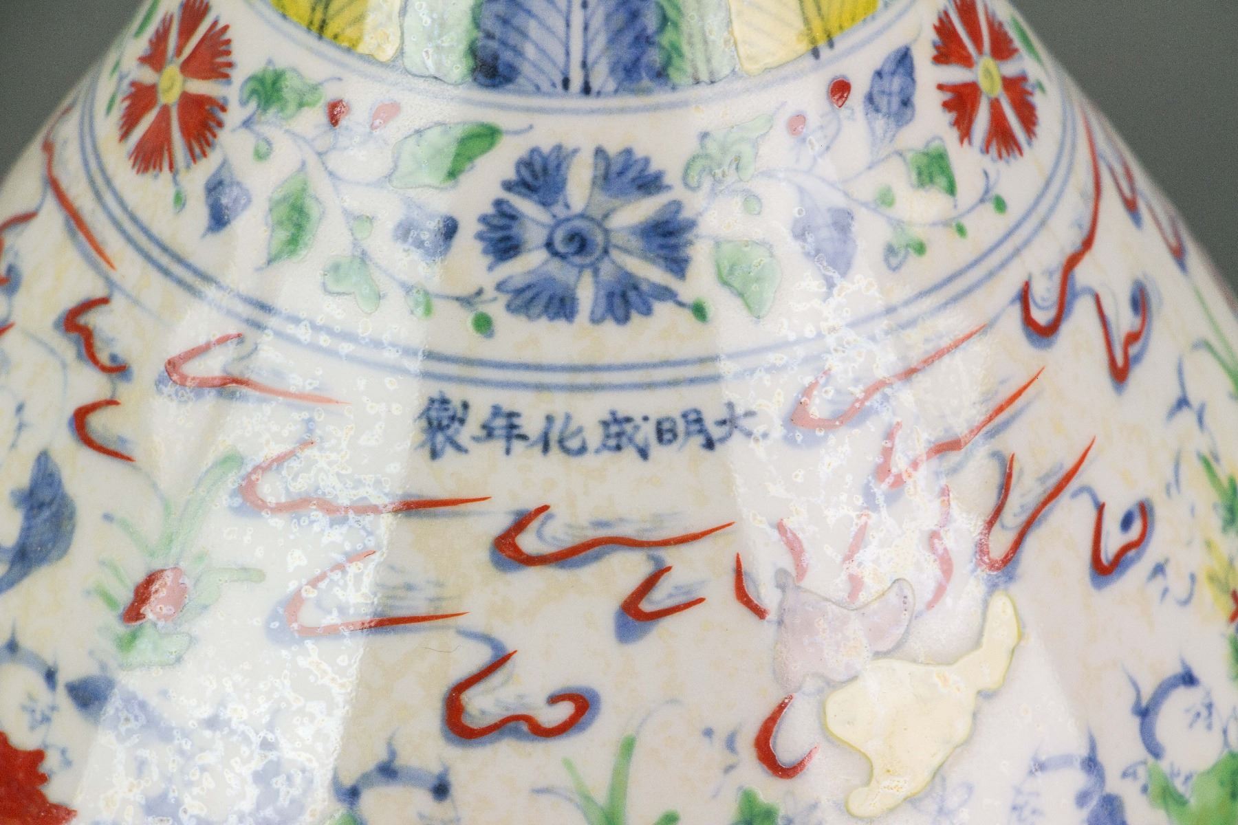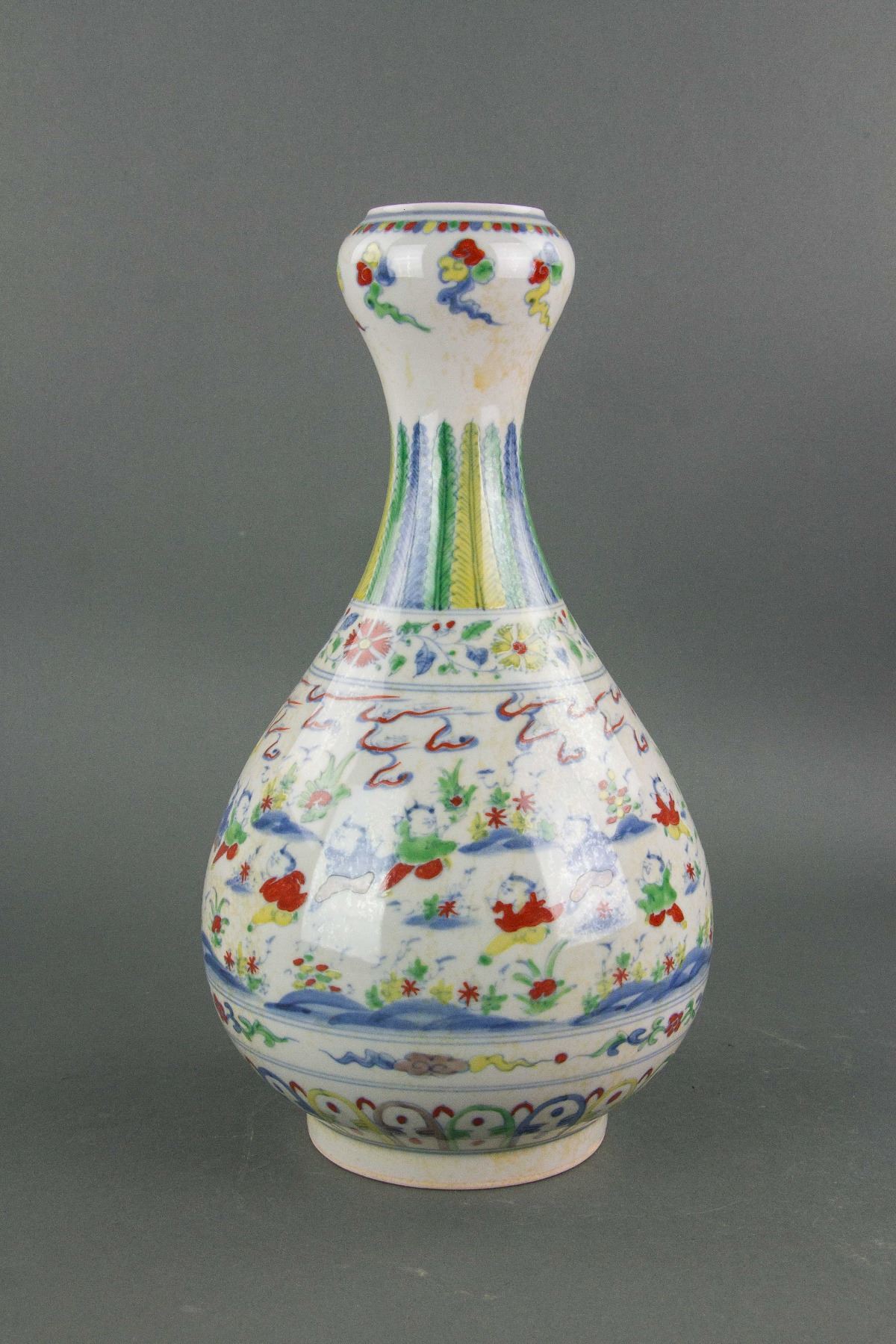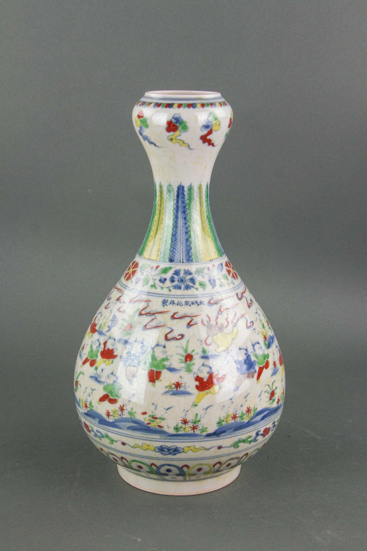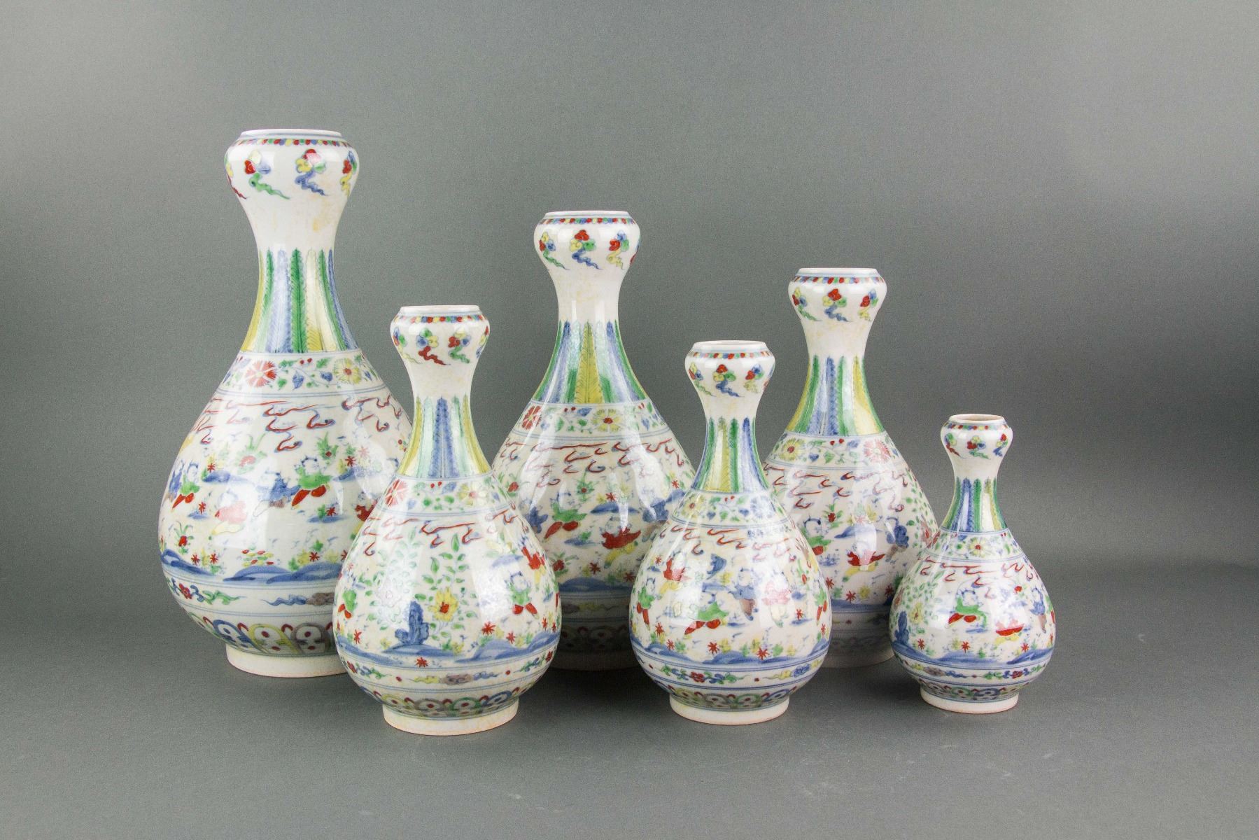 Six pieces of varied size Chinese doucai porcelain vase; of pear shape body with garlic like mouth; supported on short foot rim; painted with playing children and floral pattern; six-character Chenghua mark on shoulder; seven-character "Yu Ci Zhao De Gong Zhen Cang" on base; H: 17 cm, D: 10.5 cm, 233 grams (1/6) H: 21.5 cm, D: 13 cm, 404 grams (2/6), H: 23.5 cm, D: 13.5 cm, 522 grams (3/6) H: 25.5 cm, D: 14.5 cm, 652 grams (4/6) H: 28.5 cm, D: 16.5 cm, 914 grams (5/6) H: 34 cm, D: 18.5 cm, 1576 grams (6/6)