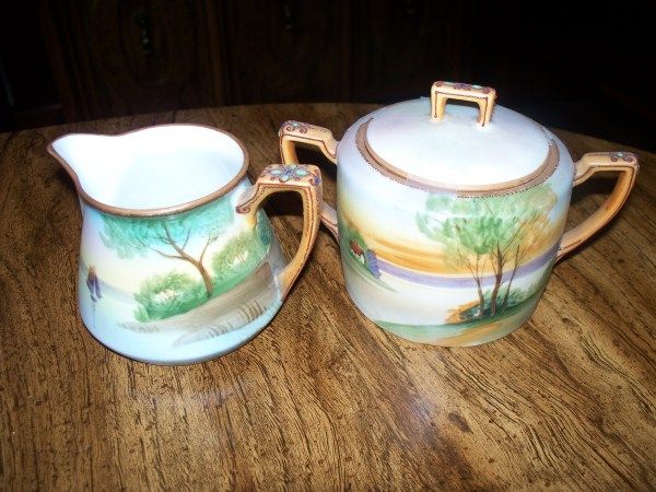 6 PC. NIPPON SUGAR, CREAMER, CUPS AND SAUCERS - LAKE SCENE