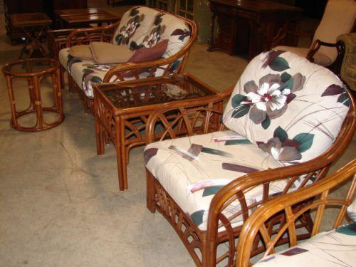 6 PIECE RATTAN PATIO SET. Consists of 2 arm chairs (33” H to top of backs), 2 end tables (21.5” H, 20” W, 27.5” D), small circular coffee table (20” H, 18” Dia.), & loveseat (33” H to top of back, 56” L).