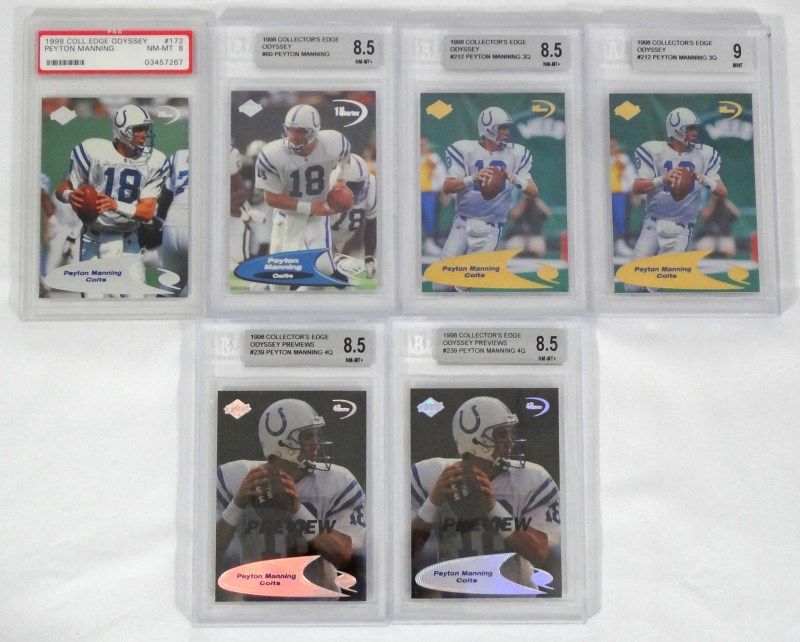 1998 COLLECTORS EDGE PEYTON MANNING ROOKIE CARDS, 5-GRADED BY BECKETT 8.5 - 9, 1 PSA NM-MT 8, ALL ROOKIES, EST $140-$170