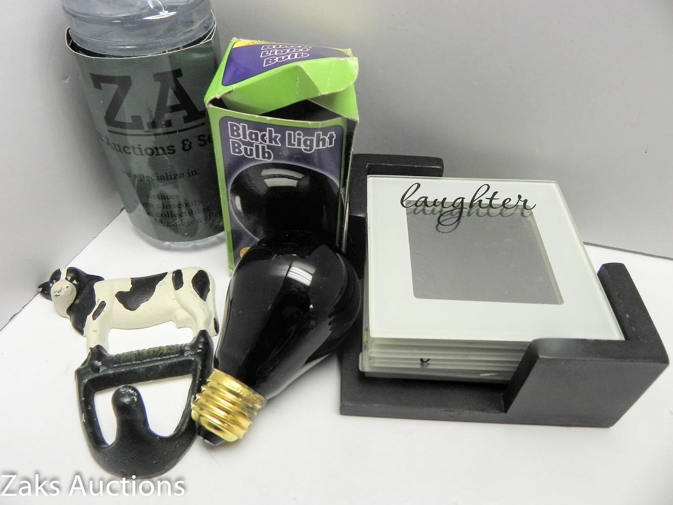 6 PICTURE INSERT COASTERS, BLACK LIGHT BULB, COW WALL MOUNT HOOK