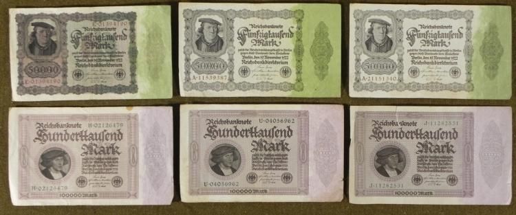 6 PIECES OF PRE-NAZI GERMAN INFLATION CURRENCY-1920'S * SAME *