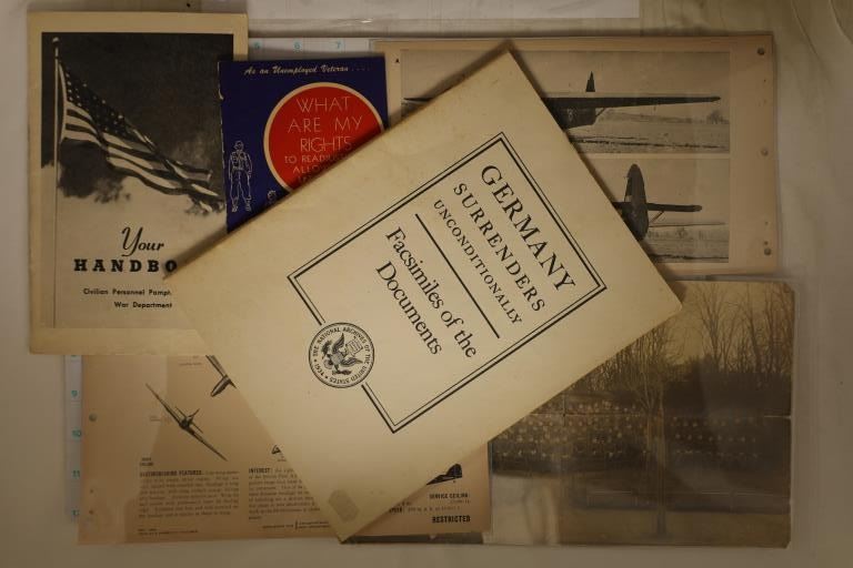 CORSA AIRCRAFT, FULMAR AIRCRAFT, LARGE PHOTO OF MILITARY SOLDIERS, CALIFORNIA DEPT. OF UNEMPLOYMENT OF WWII VETERANS, WAR DEPT. HANDBOOK 1945 AND 1945 GERMANY SURRENDERS UNCONDITIONALLY FACSIMILES OF THE DOCUMENTS