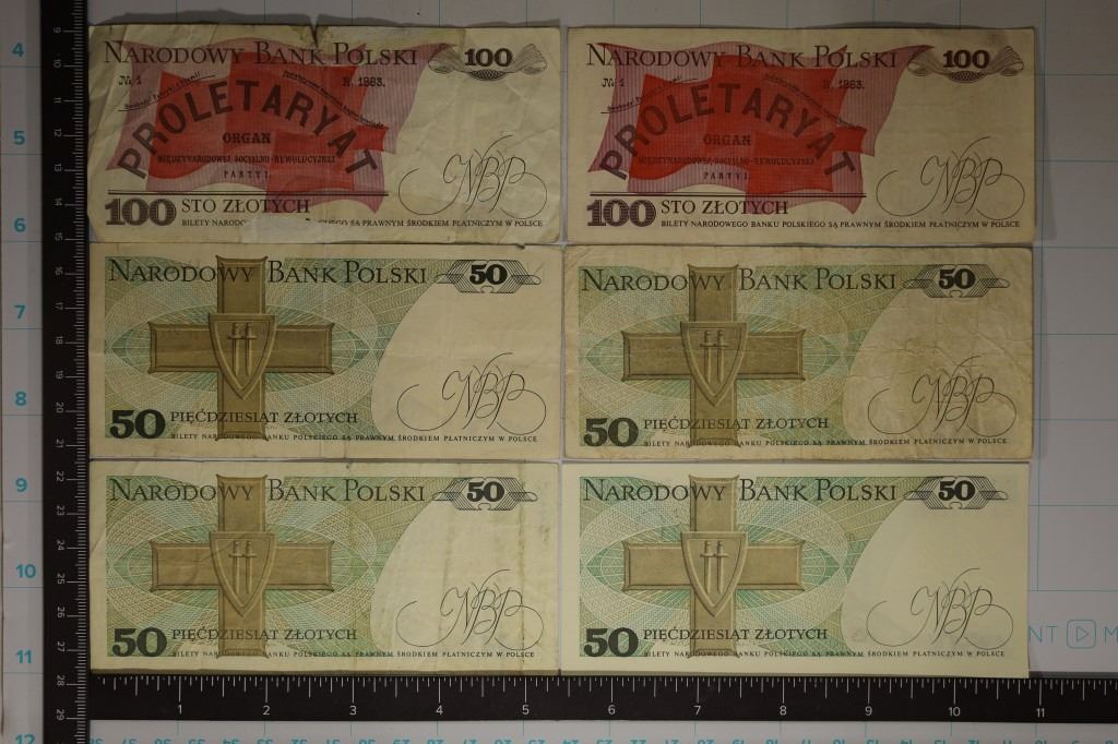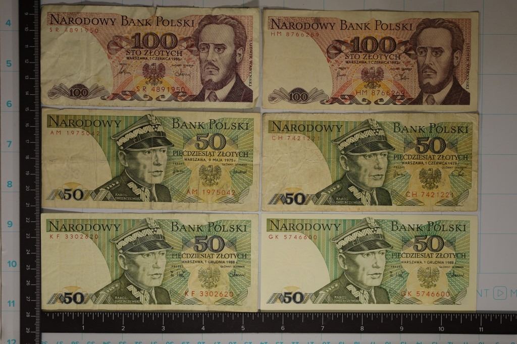 AND FOUR-50 ZLOTYCH ( 1975, 1979 & 2-1988) ONE OF THE 50'S IS CRISP UNC AND SMALL TEARS NOTED ON ONE OF THE 100'S