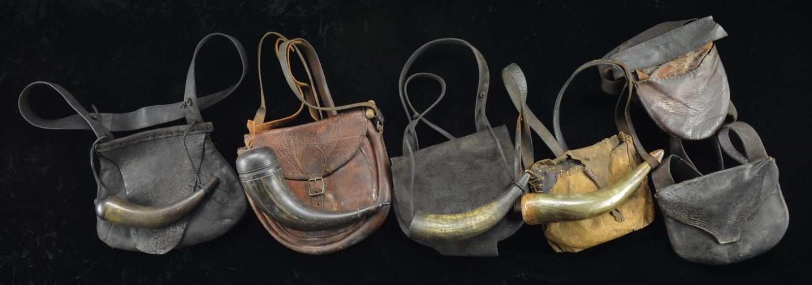 2) 9" x 7" x 2" black leather bag w/ shoulder strap. 8 1/2" Overall powder horn attached by leather strap. CONDITION: Good overall w/ wear.