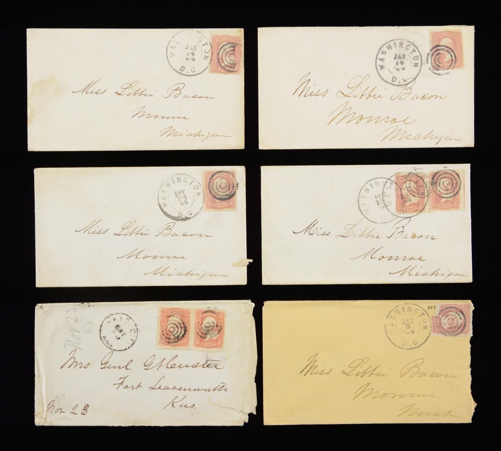 LIBBIE. 5 postal covers addressed to "Miss Libbie Bacon" which no doubt contained love letters from George during their courtship. Libbie destroyed all these personal letters, but retained the envelopes which directly descended from her. The last postal cover has 2nd person autograph as Custer addressed: Mrs. "G A Custer" Fort Leavenworth, Kans Nov. 23, 1868. CONDITION: good overall, soiling, torn edges. PROVENANCE: General George A and Elizabeth Custer; Margaret Flood (Libbie Custer’s personal assistant); Spink Smythe, part-lot 1088 August 22, 2012; Martin Lane Historic & Western Americana Lifetime Collection. (02-21902/JS). $1,000-2,000.