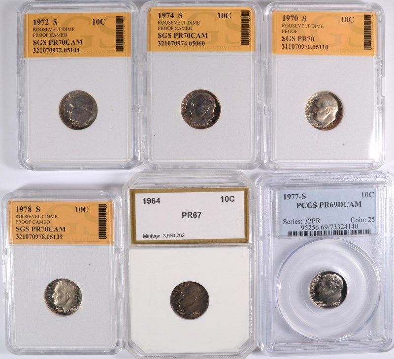 (6) PROOF SLABBED ROOSEVELT DIMES (64, 70-S, 72-S, 74-S, 77-S, 78-S)