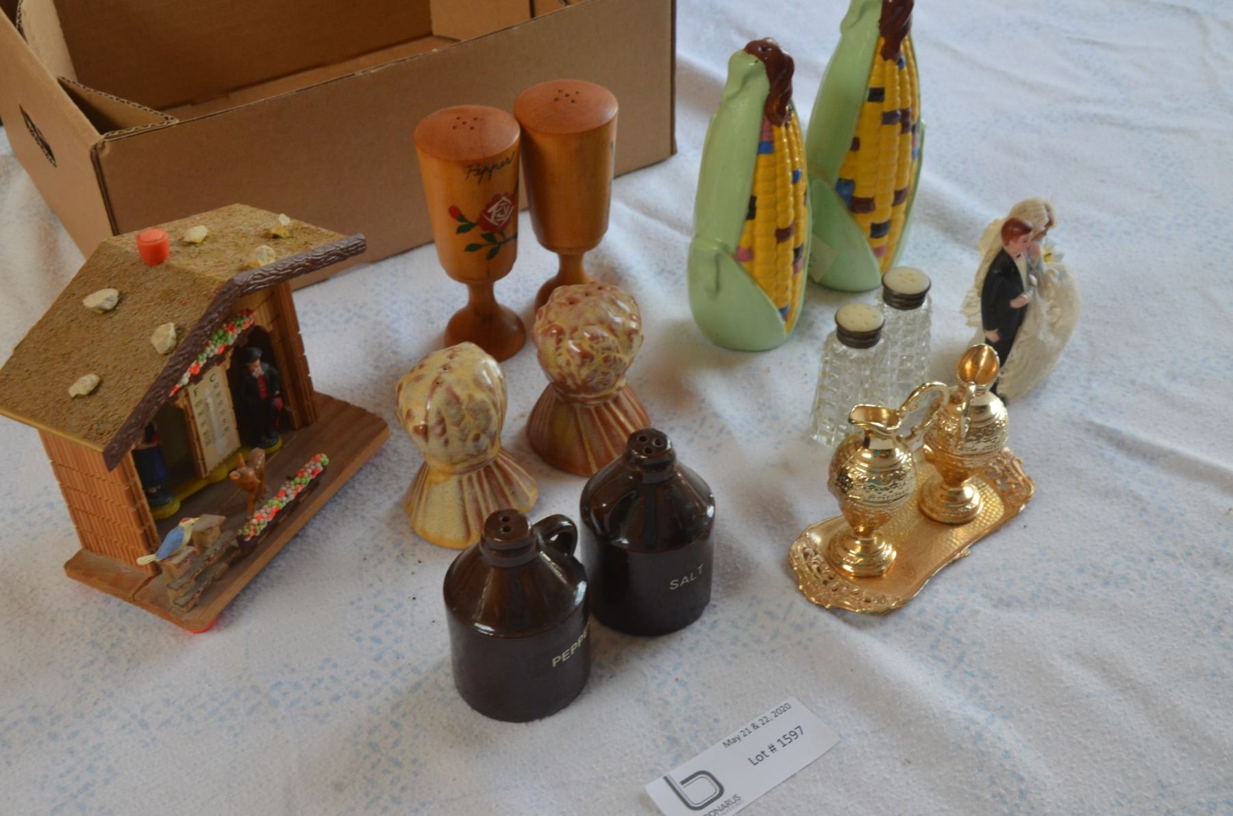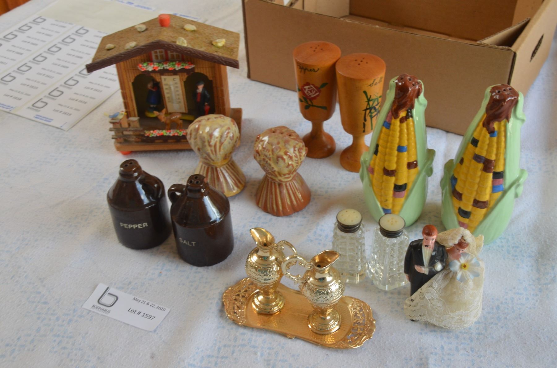 6 Pairs of Salt and Pepper Shakers and Ornate Thermometer
