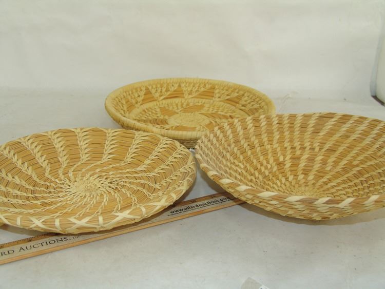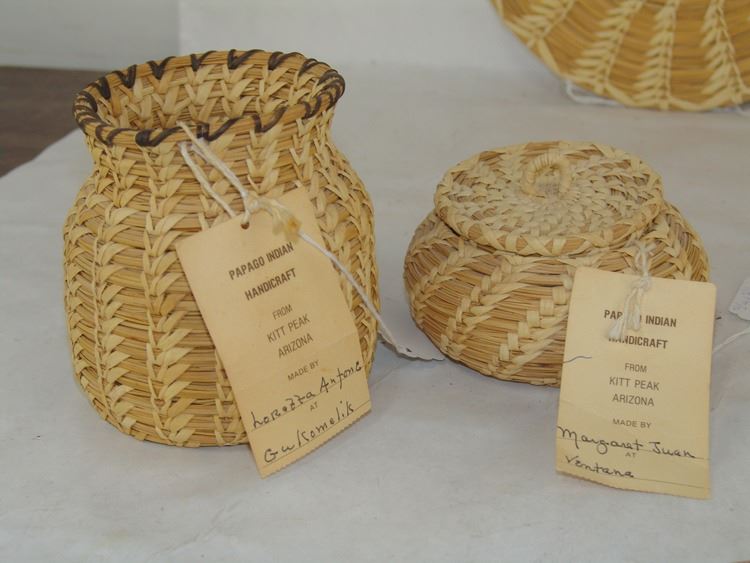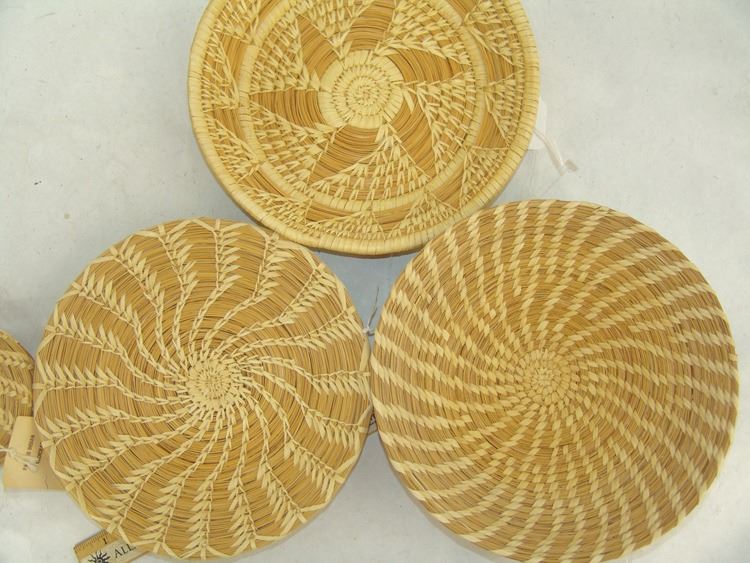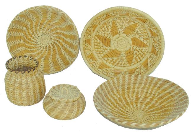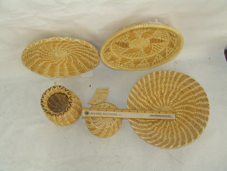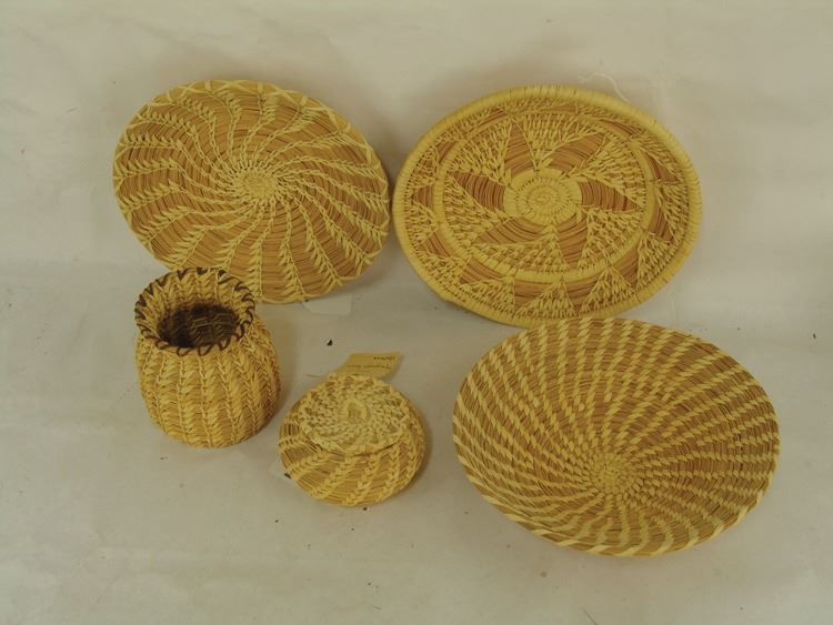 All done in traditional Tohono O'odham wheat stitch including a large bowl, three similar-sized trays, a lidded bowl by Margaret Juan, and a small olla by Loretta Antone. All in very good condition. All great,Mid/Late 1900s,Largest 8" x 11"