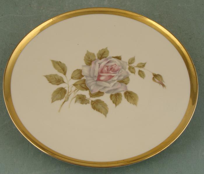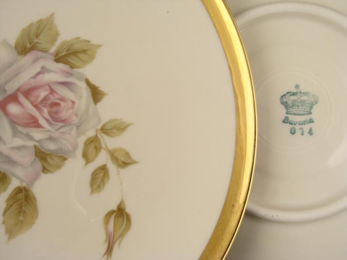 This 6 piece Bavarian tea grouping has generous bands of gold trim, with elegant pink and lilac tone flowers. These are in very good condition, with no chips or cracks, and only some minor scuffs from use. Each has a hallmark on back with crown and number. They date from the 1950's.