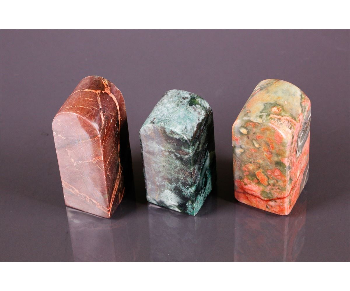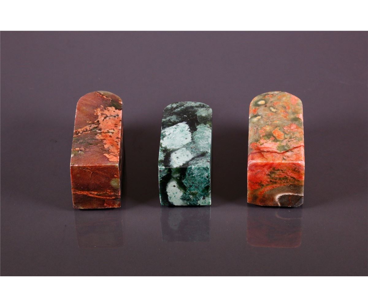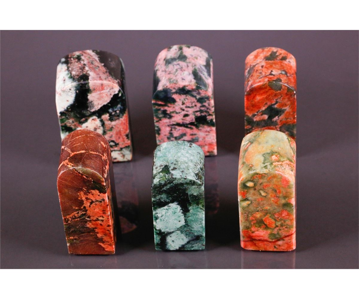Six pieces of Chinese varieties blood stone seals; uncarved bottom; of mixed red, black and turquoise tone; H: 9 cm, W: 4 cm, 2060 grams