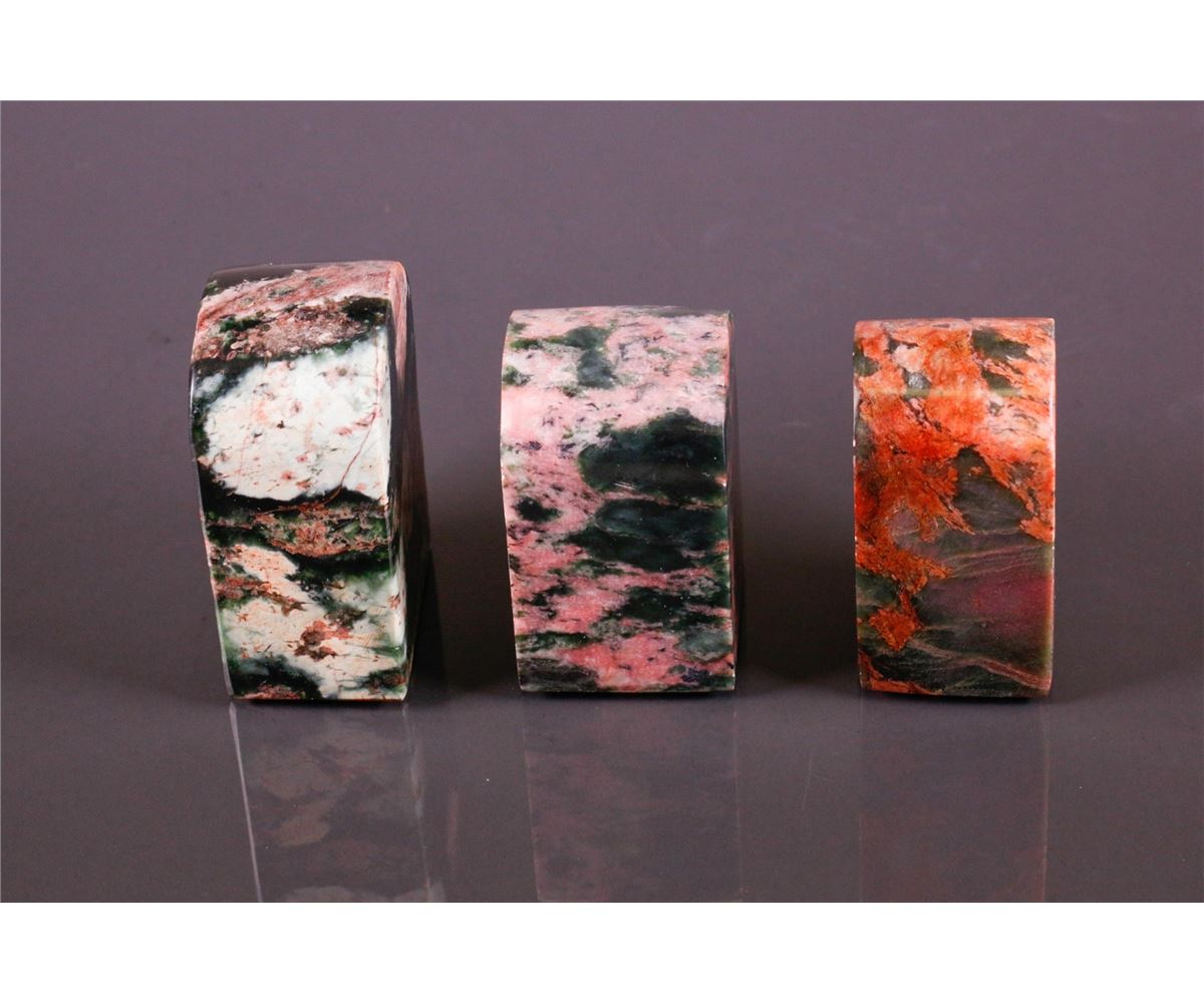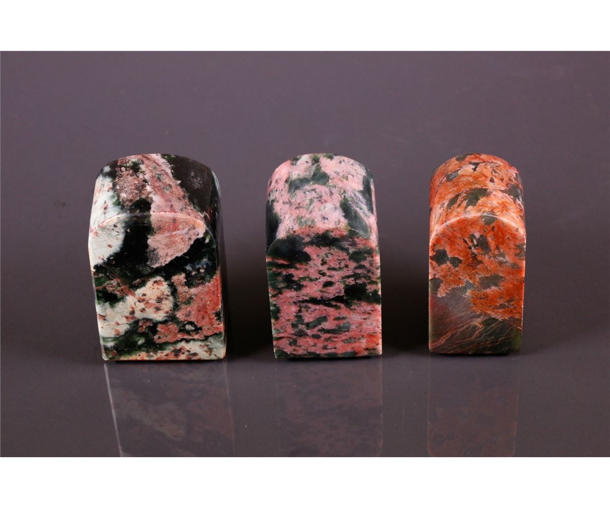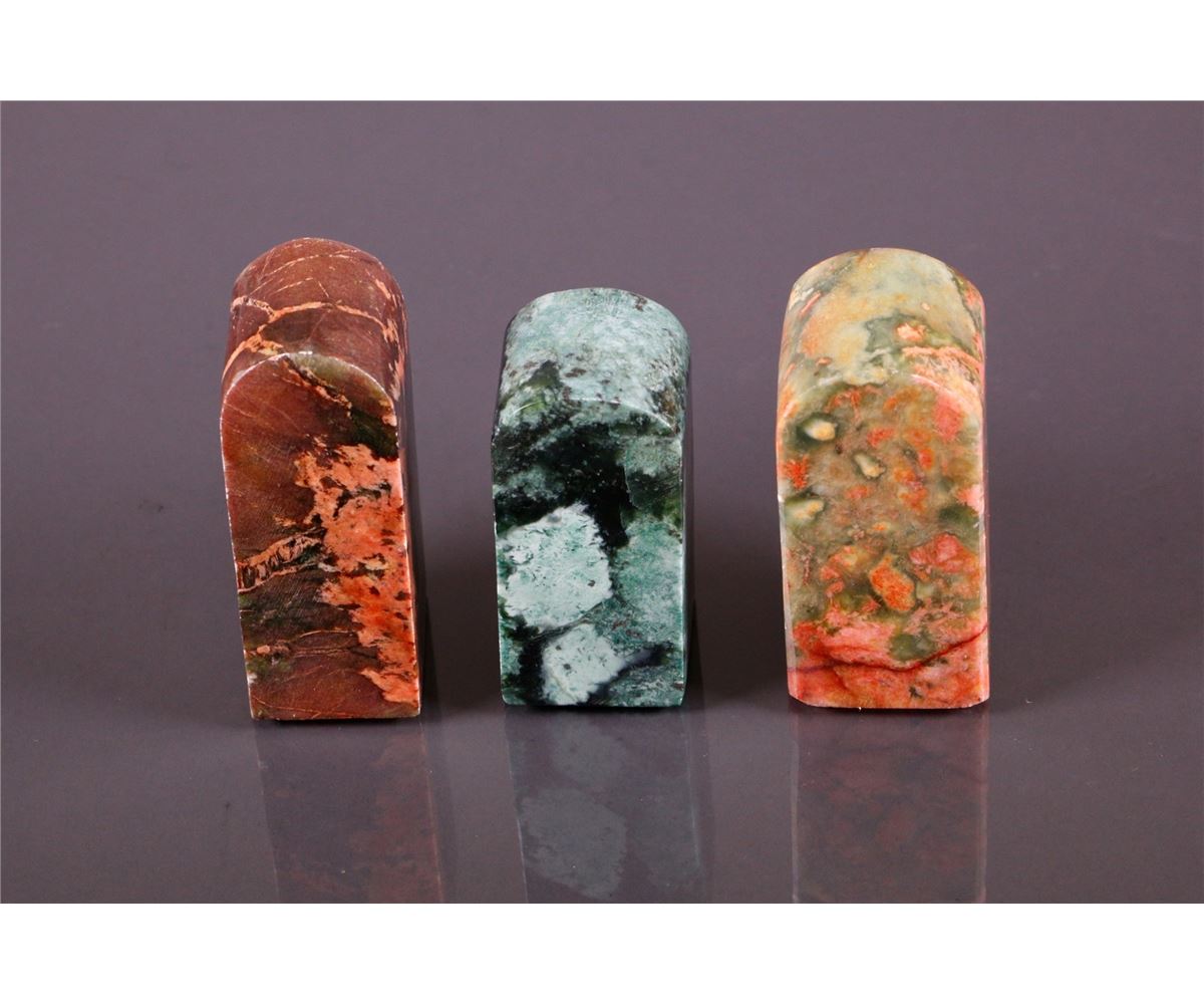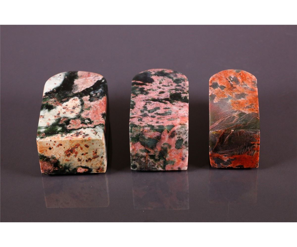 Six pieces of Chinese varieties blood stone seals; uncarved bottom; of mixed red, black and turquoise tone; H: 9 cm, W: 4 cm, 2060 grams