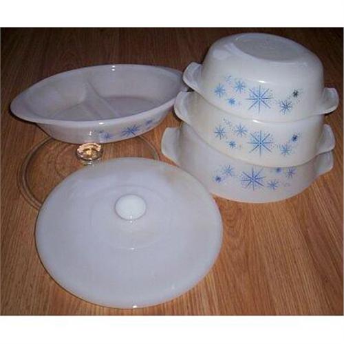 <tr><td>Title:6 Pc Set Fire King Bakeware Starlight Pattern</td></tr>