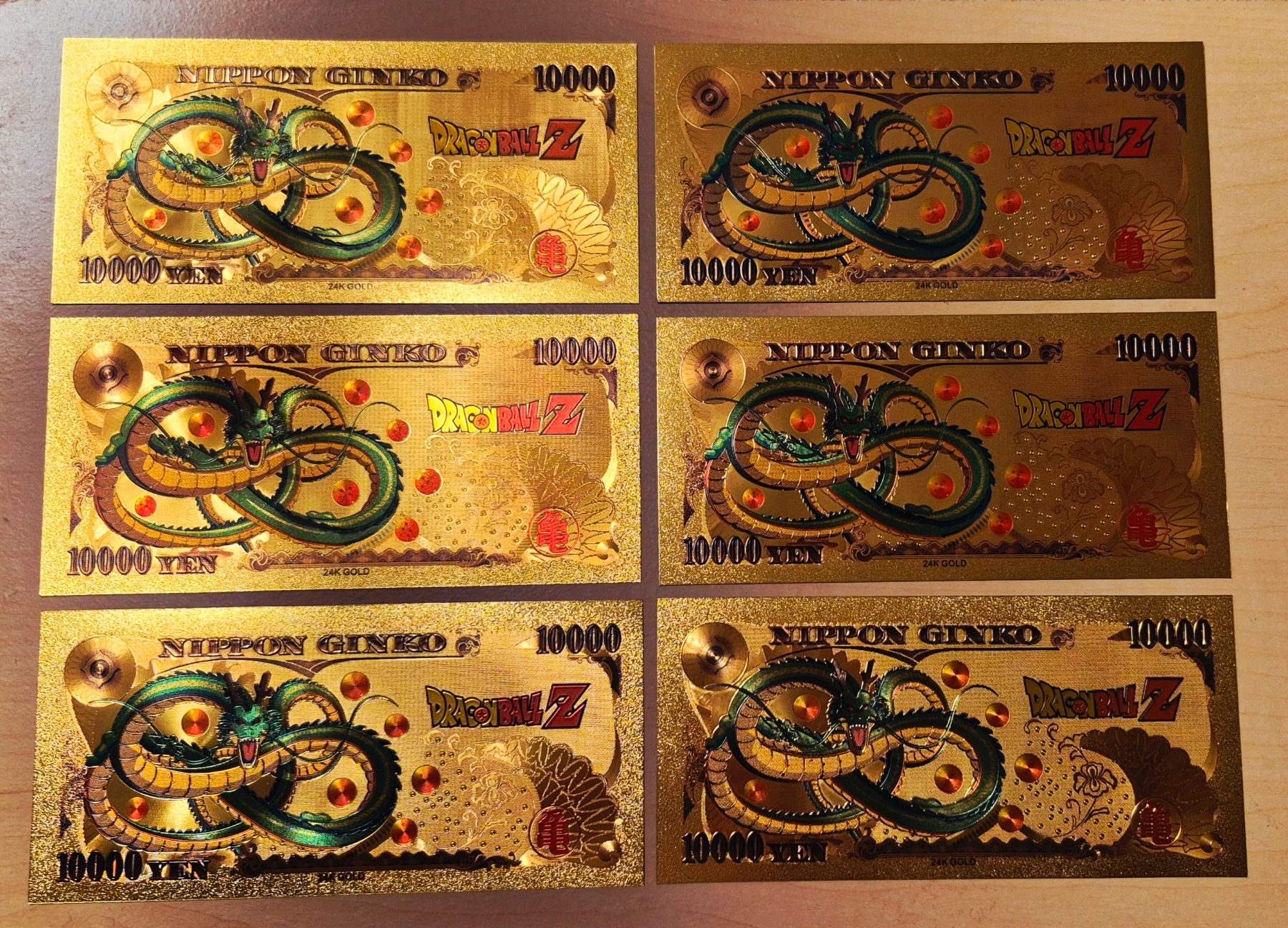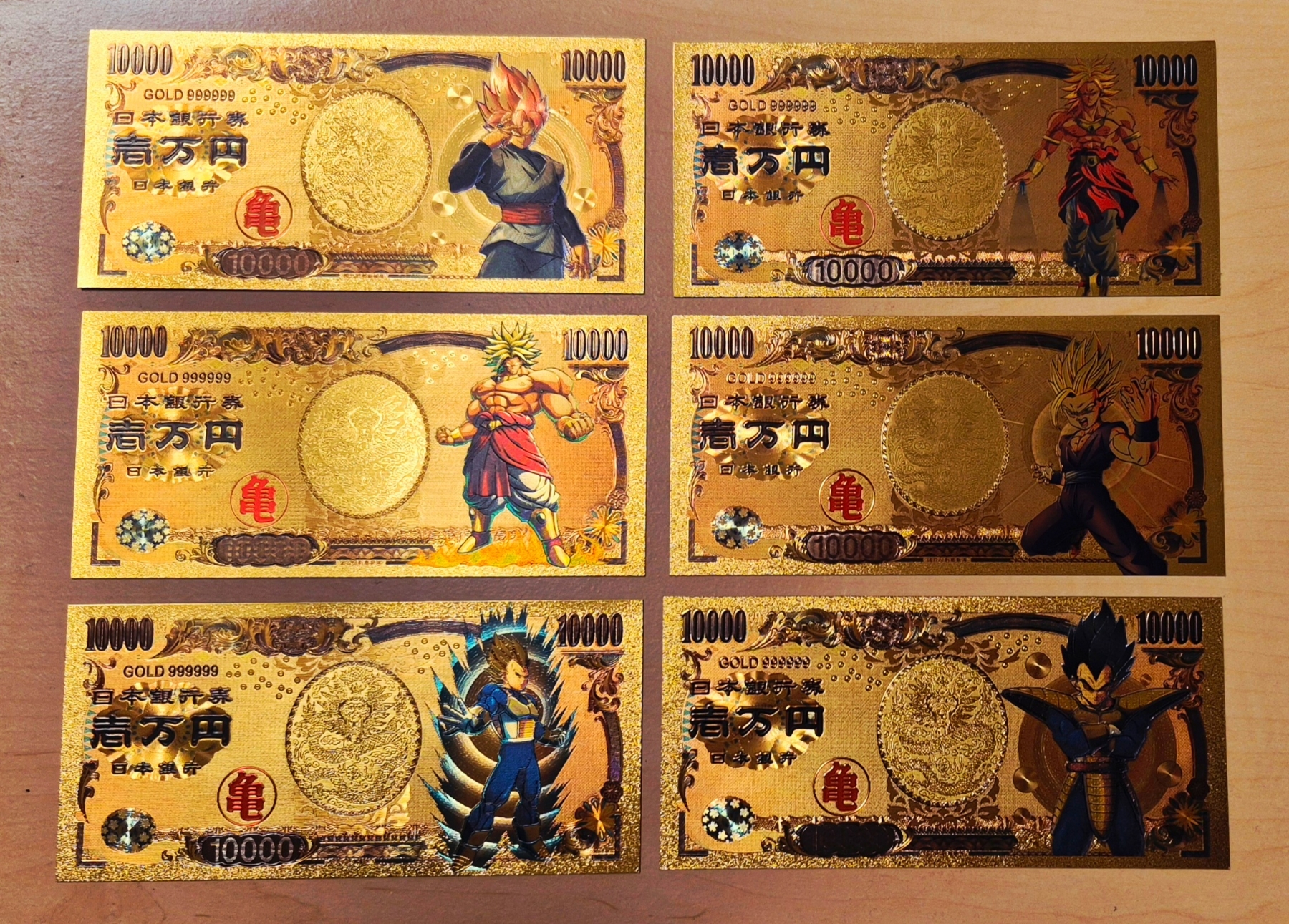 6 Pc Set Pure 24k .999 Gold Foil "Dragon Ball Z" Nippon Ginko Bank Notes - Each In Mint Condition - These Highly Collectible Japanese Game Characters depicted on each note are authentic characters from the Dragon Ball Z gamiong universe. Processed in Pure Gold Foil, Colorized and Embossed, producing a shimmering golden collectible piece of Japanese Digital Gaming Art. The gold foil is sealed between ultra thin super clear laminate. Overall weight of each note is 3 to 4 grams.