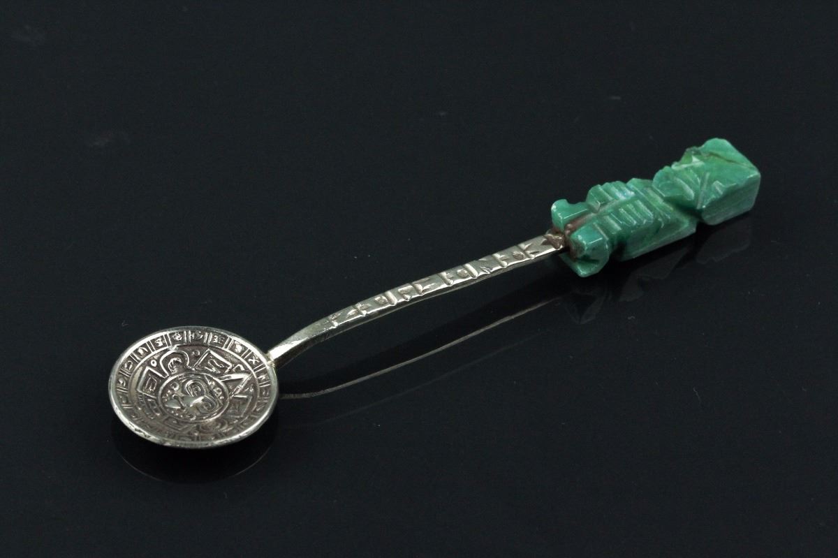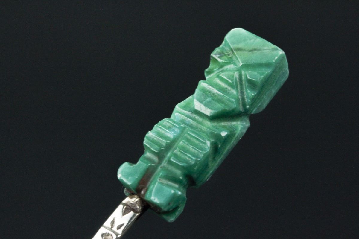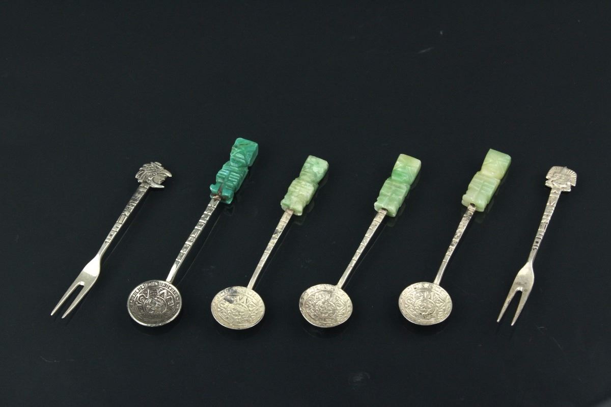 Six pieces of silver spoons and forks with silver mark 925; comprised of four green-hardstone-handled spoons and two carved forks; L: 10 cm, W: 2 cm, 54 grams total