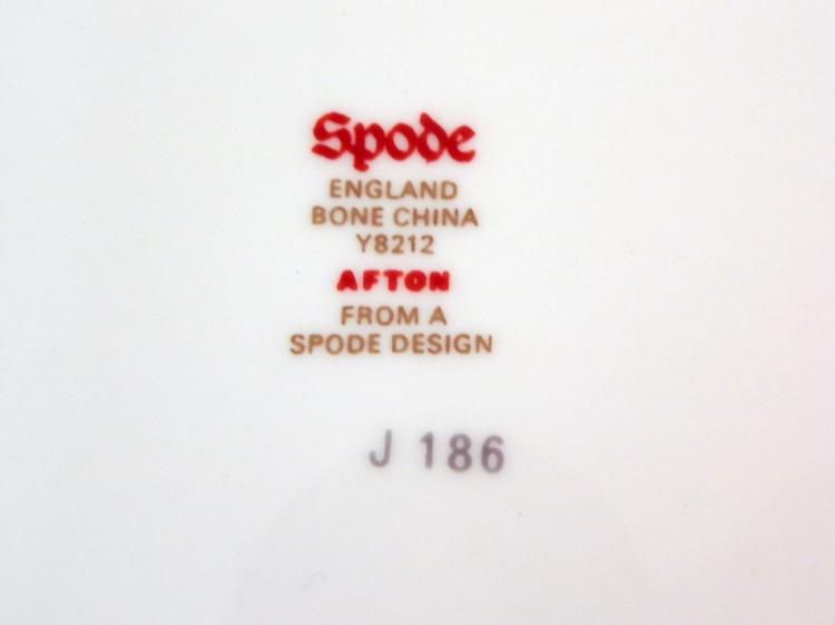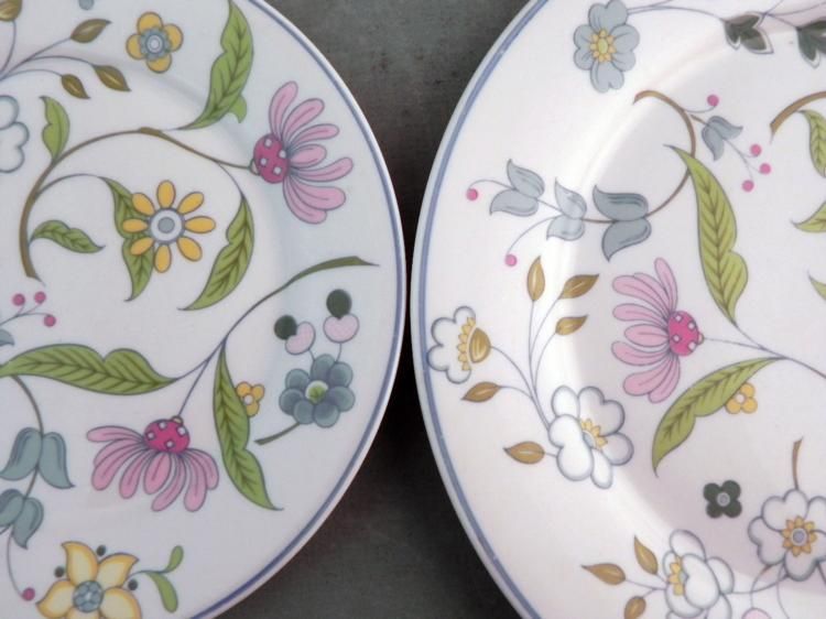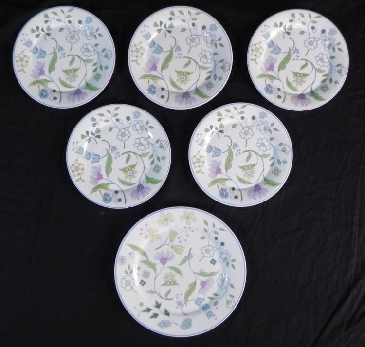 This is a 6 piece set of bone China bowls, made in England. These are Afton, from a Spode Design, pattern Y8212. They have lovely little flowers, in soft colorful hues. * * Included are:6 1/4" plates (x5) * 8" plate * * * They are in excellent condition, a couple with minor rim chips. These will make a pretty table for desserts or snacks.